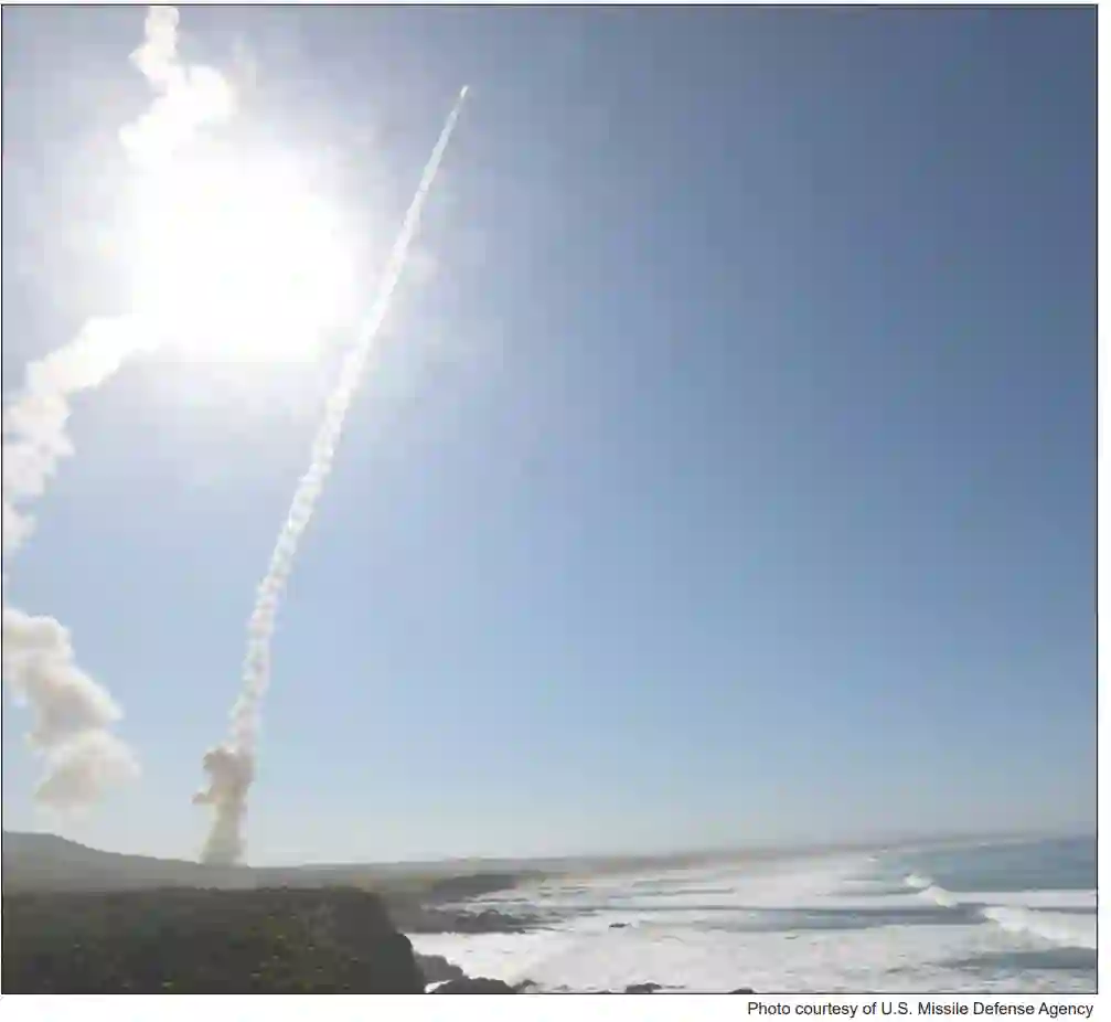 图:2019 年 3 月 25 日,从加利福尼亚州范登堡空军基地发射一枚地基拦截器,对具有威胁代表性的洲际弹道导弹目标进行首次齐射接战测试。