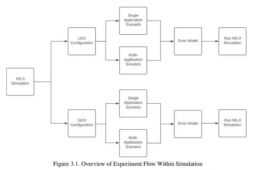 本研究支持AFRL远程医疗网络威胁研究项目,旨在为未来恶劣与降级环境下远程医疗网络基础设施设计提供实验依据,确保关键性能标准。为获取降级环境对卫星通信的影响数据,可复现、易操作且低成本的仿真工具具有显著优势。本研究重点回答以下问题:GEO与LEO系统在不同场景下如何受链路降级影响;单/多应用在近理想与对抗条件下对同一卫星链路的性能差异。所有实验保持相同仿真参数以确保可比性。为实现网络链路降级效应分析,仿真将在卫星链路中引入误码模型,探究多应用并发使用时的链路降级效应。