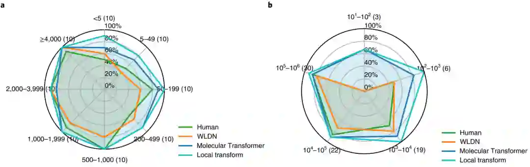 3.2 与专家对比结果 从测试集中获取80个稀有有机反应,人类专家和WLDN、Molecular Transformer、LocalTransform模型同时进行预测,参与实验的11位专家中选取得分最高的人,预测结果如图5a所示,可以看出LocalTranform取得了最好的结果,正确预测了 80 个反应中的 75 个。基于文中提出的GRT再次对数据进行分类,LocalTranform依然取得了最好的结果,如图5b所示。