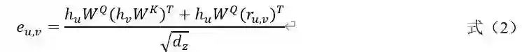 其中Wq和Wk分别是查询权重和键权重,T是转置运算符,dz为归一化因子,ru,v为相对位置embedding,可以通过公式(3)获得Du,v。