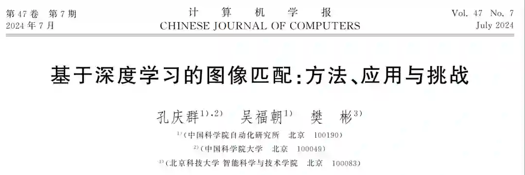 图像匹配旨在建立图像之间的点对应关系,是许多计算机视觉任务的关键环节.近年来,随着深度学习技 术的发展,图像匹配方法已从以手工设计特征为主转变为基于深度网络的方法,基于深度学习的图像匹配方法在 多个标准数据集上展现出卓越的性能,推动着多个相关应用的发展.围绕图像匹配涉及的若干关键问题,如:特征 点检测、特征点描述、稠密点匹配、误匹配去除,本文对深度学习图像匹配方法进行了系统性总结.首先分析了领域 内基于深度学习的典型方法和关键技术,随后介绍了与图像匹配密切相关的几个典型应用并给出其现状分析,最 后,根据对图像匹配领域技术发展的分析总结,结合作者在该领域的长期研究积累,本文给出了目前图像匹配所面 临的主要挑战以及未来发展趋势.