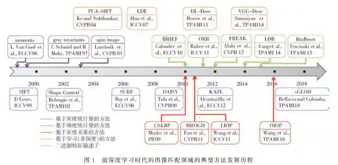 http://cjc.ict.ac.cn/online/onlinepaper/kqq-202479160641.pdf 图像 匹 配 旨 在 建 立 不 同 图 像 之 间 相 同 物 理 点[1,2]或者相同语义点之间的对应关系[3,4],其中后 者亦称为语义匹配,本文主要讨论面向前者的图像 匹配方法,两者的具体定义和区别详见第2节.建立 同一实际物体在不同图像之间的点对应关系,是三 维计算机视觉的基本出发点[5,6],许多三维计算机 视觉的理论都建立在已知图像点对应关系基础上, 三维重建[7,8]、相机姿态计算[9]、视觉定位[10,11]、图 像拼 接[12]、增 强 现 实[13]、同 步 定 位 与 地 图 绘 制 (SimultaneousLocalizationand Mapping,SLAM)[14-16] 等三维计算机视觉应用都离不开高质量的图像匹配 算法.此外,高质量的图像匹配算法还可直接应用于 物体识别[1,17]、目标跟踪[18,19]等经典计算机视觉问 题,而且遥感图像和医学影像处理中的图像融合与 变化检测等应用方向[20-23]均离不开图像匹配.可以 说,图像匹配是计算机视觉和图像处理领域极具应用 价值的一个研究方向,得到了研究人员的广泛关注. 早期的图像匹配方法以手工设计的特征为主, 其中最 具 代 表 性 的 工 作 是 SIFT (ScaleInvariant FeatureTransform)[1]和 SURF (SpeededUpRobust Features)[24],尤其是SIFT,不仅推动了图像匹配领 域的技术进步,还影响了图像识别、目标检测等众多 计算机视觉技术的发展.例如:在 SIFT 基础上提出 的 HoG (HistogramofGradients)[25,26]特征在深度 学习出现之前一直都是行人检测领域的主流方法, 并 在 一 般 性 的 目 标 检 测 领 域 也 得 到 了 广 泛 应 用[27,28],而基于 SIFT 这种局部图像特征发展起来 的视觉词袋(BagofVisualWords)[29,30]方法则在很 长一段时间都主导着图像分类技术的发展.比SIFT 计算更加高效的 SURF 方法则推动了许多对实时 性图像特征点匹配有要求的应用技术发展,如:目前 广泛使 用 的 视 觉 SLAM 方 法,即 ORB-SLAM 系 列[14,31,32],依 然 是 基 于 手 工 特 征 ORB (Oriented FASTandRotatedBRIEF)[33]的方法. 图1概括了前深度学习时代图像匹配领域典型 方法的发展历程,包括最早期的基于灰度统计量的 方法[34-36]、后续出现的基于梯度统计量[1,2,24,37]、基 于灰度大小关系[38-40]和基于二进制特征表示的方 法[33,41,42],以及在深度学习出现之前使用传统机器 学习方法进行数据驱动的图像匹配方法的一些尝 试[43-45],更多关于手工设计的图像特征匹配方法的 介绍可参考综述论文献[7,46-48],本文聚焦于深度 学习时代的图像匹配. 随着深度学习技术的不断发展[49-52],图像匹配 领域也取得了长足的进步,出现了许多优秀的基于 深度学习的方法,在图像匹配涉及的多个方面均取 得了显著效果,如:图像特征点检测[53]、图像特征点 描述[54]、稠 密 图 像 点 匹 配[55]、错 误 匹 配 点 滤 除[56] 等.相比传统的手工设计方法以及非深度学习的机 器学习方法,基于深度学习的图像匹配方法不仅在 图像匹 配 相 关 的 数 据 集 上 取 得 了 卓 越 的 性 能 提 升[47,57],而且在多个以特征匹配为基础的下游任务 上展现出强大的应用潜力,包括基于图像的大场景三 维重建[7,58]、基于图像的定位[11,59]、视觉 SLAM [60]、 多模态融合[22,61,62]等.尽管文献中提出的许多方法 在不同方面促进了图像匹配技术的进步,已有的综 述主要聚焦于总结稀疏特征点匹配中不同的特征点 检测与特征点描述方法[47,48,63]、或者基于某个特定 任务/数据集对不同的特征点检测与描述方法的组 合进行性能对比分析[7,61,64,65],本文从稀疏特征点 匹配与稠密点匹配两个角度,聚焦于近年来深度学 习在这两个领域相关技术问题上的突破、对已有方 法进行了深入总结与分析,并且对误匹配去除、典型 的下游应用技术进展进行了详细介绍,给出了相关 研究所涉及的数据集,力求给读者展现出图像匹配 这一领域的全貌和最新的技术突破点,帮助进入该 领域的研究人员快速掌握图像匹配的内涵、难点、关 键技术与数据集资源等. 本文首先在第2节给出图像匹配问题的正式定 义和研究难点;之后,将在第3节至第5节对近年来 该领域的代表性方法进行综述,总结分析现有方法 的特点、内在联系、发展历程,以及关键技术等,涵盖 稀疏特征点匹配、稠密像素点匹配和错误点滤除三 个方向,试图给读者一个关于该领域的发展、现状和 关键技术的全面了解.另一方面,深度学习的出现也 革新了许多计算机视觉问题的技术路线,如:基于局 部图像特征的视觉词袋模型[29]在深度学习出现之前占据了图像分类方法绝对的主导地位,而深度神 经网络端到端学习能力使得图像分类这一典型的计 算 机 视 觉 问 题 不 再 依 赖 于 局 部 图 像 特 征 的 设 计[49,52],目 标 检 测 也 不 再 依 赖 繁 琐 的 特 征 工 程[66,67].换句话说,随着深度学习技术的进步,图像 特征匹配以及相关的局部图像特征提取的应用范畴 也发生了较大变化,本文将在系统总结分析基于深 度学习的图像匹配方法基础上,在第6节给出一些 目前仍然极度依赖局部图像点对应关系的典型应 用,并介绍其现状,第7节对图像匹配及其下游应用 任务的研究中经常使用的数据集进行介绍.最后,值 得指出的是,尽管深度学习技术在图像匹配问题的 成功应用,使得图像匹配技术的发展取得了可喜的 进步,实际应用需求的不断延申也对其提出了新的 要求,本文第8节将对该领域的现有挑战与未来发 展方向进行展望.