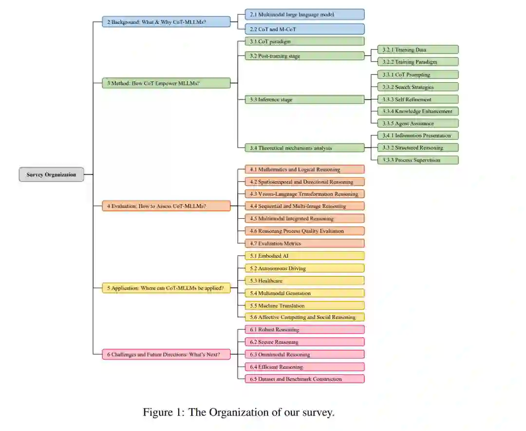 为综合当前研究进展,已有多篇综述(Wang et al., 2025f; Bi et al., 2025; Li et al., 2025c)为研究者提供了整体视角。在前人工作的基础上,本文试图从更具差异化的视角切入,更加侧重深入的理论分析。不同于现有主要聚焦于技术方法总结的研究,本文的核心贡献在于进一步分析与讨论 MCoT 提升模型推理能力的内在机制,从而回答“为什么它有效”这一关键问题。此外,在评测体系、挑战与未来方向等部分,本文提供了更系统的分类与总结。综上所述,本综述系统梳理了 CoT-MLLMs 领域的最新研究进展,涵盖其核心方法、评测基准与指标、典型应用场景,以及面临的挑战与未来发展方向。我们希望本文的洞察与总结能够为这一新兴研究方向提供结构化参考与理论基础,从而促进该领域的持续发展。
