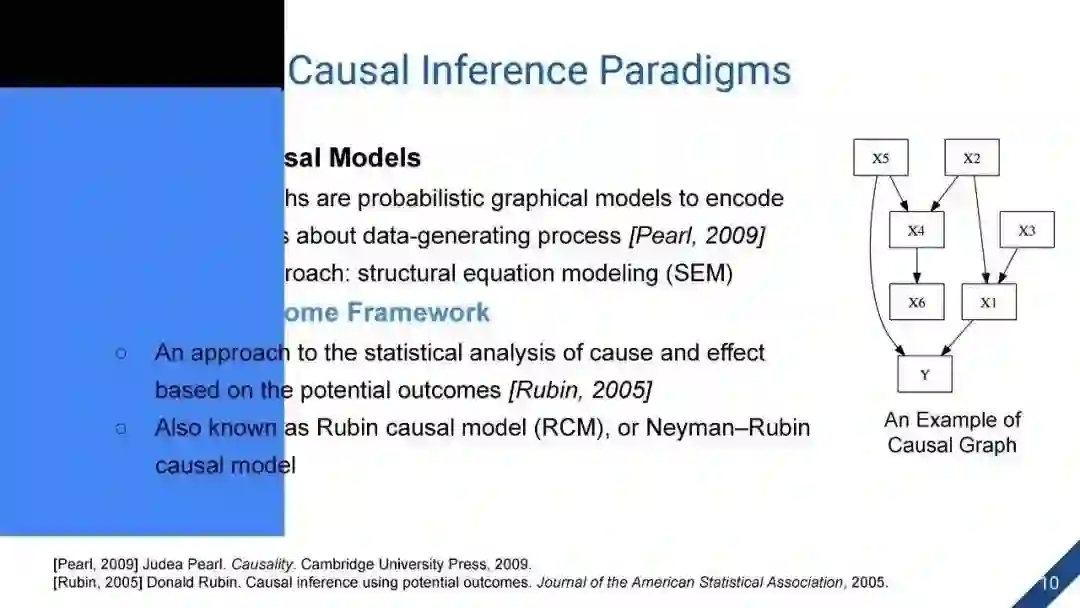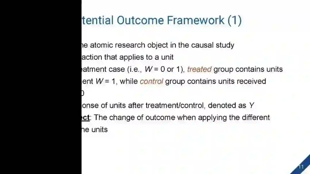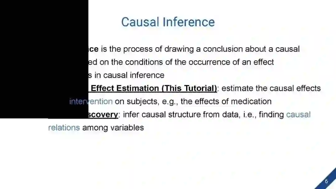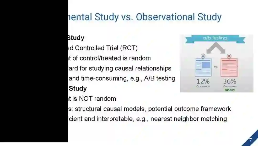 我们将首先用现实世界的例子来推动所提出的主题,例如在教育、营销、医疗健康、政治学和在线广告中提出的因果问题。然后,介绍因果推理的基本概念,以及基本的因果推理框架,如潜在结果框架和因果图模型;我们还将使用说明性的例子来解释这些概念和术语。然后,介绍因果推理中几个重要概念的形式定义和含义,包括反事实、平均处理效应(ATE)、平均处理效应对被处理单位(ATT)和个体处理效应(ITE)。简要介绍了因果推理的主要方法,包括实验研究和观察研究。我们将重点关注观察性研究的潜在结果框架,并提出具有基本假设的问题定义。