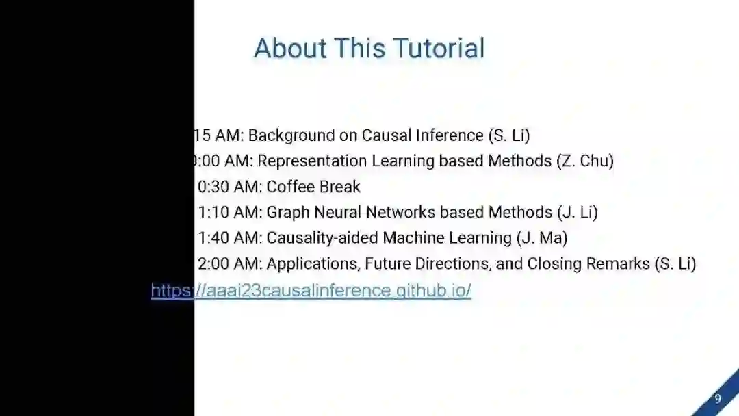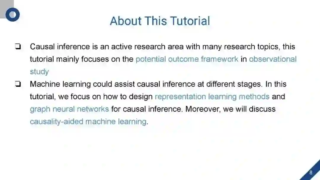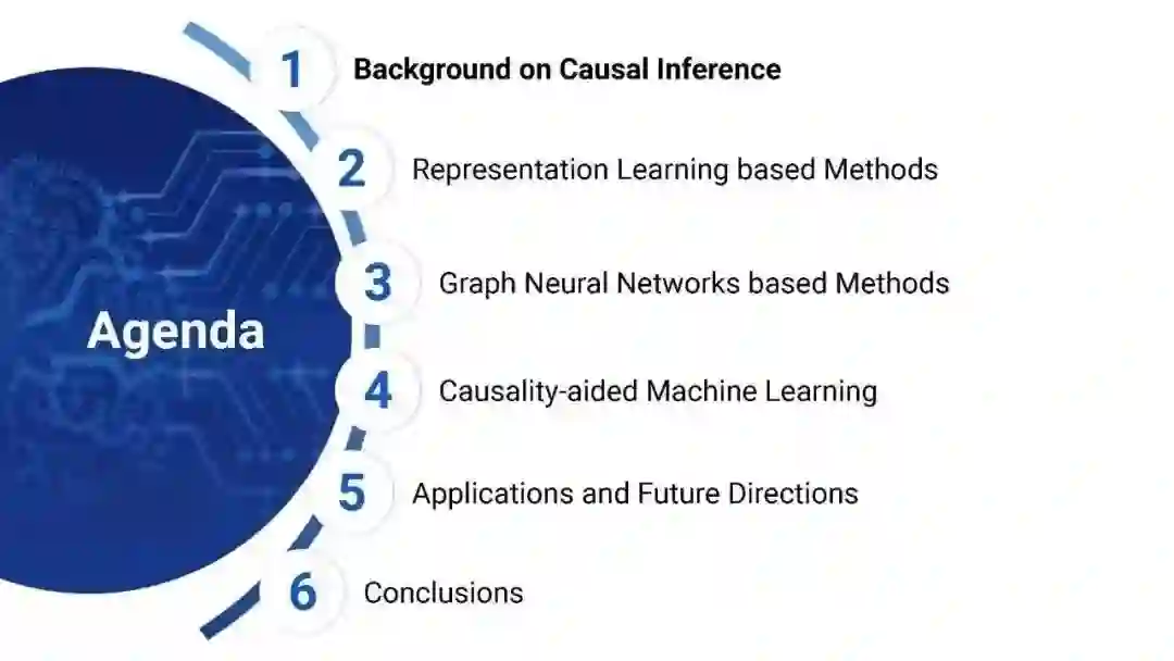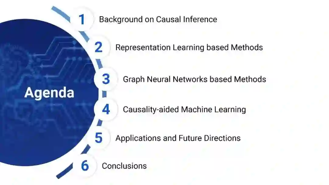 1.Welcome from Organizers 2.Background on Causal Inference 3.Representation Learning based Methods 4.Graph Neural Networks based Methods 5.Causal Inference-aided Machine Learning 6.Causal Inference Applications 7.Future Directions