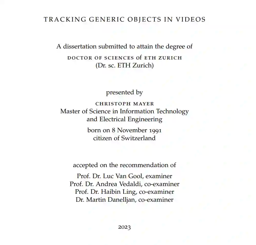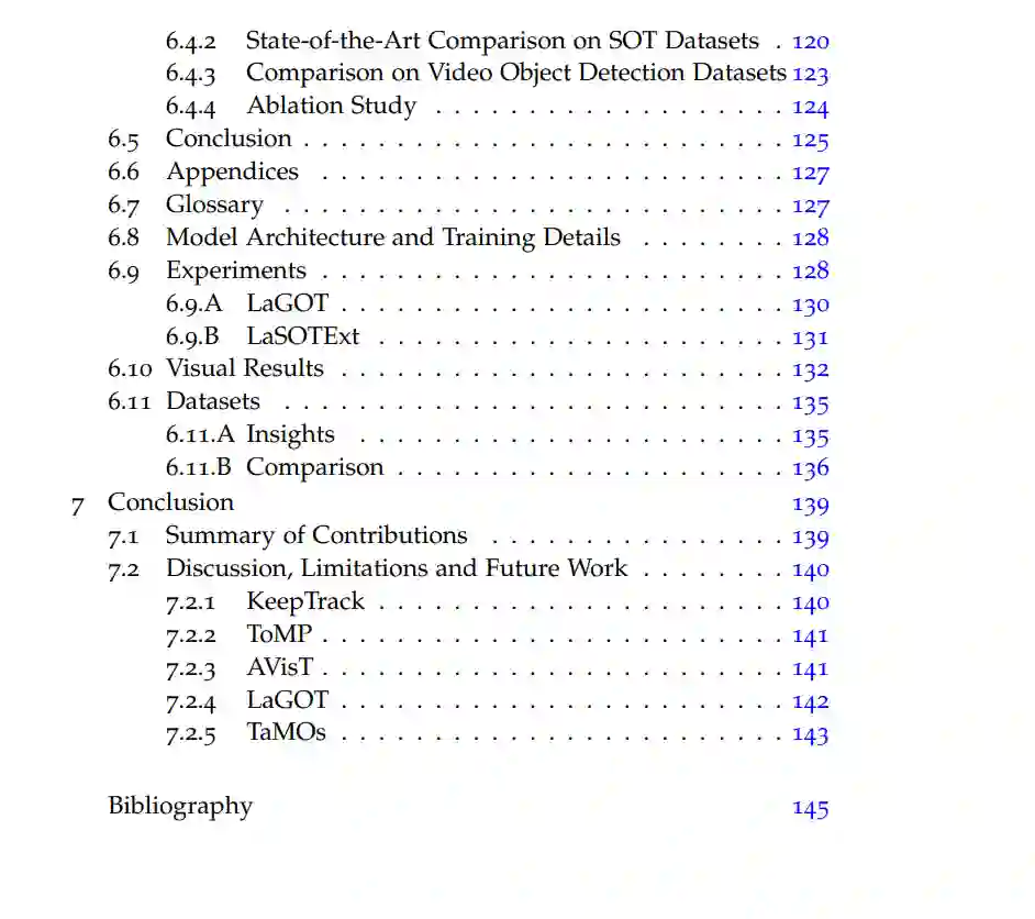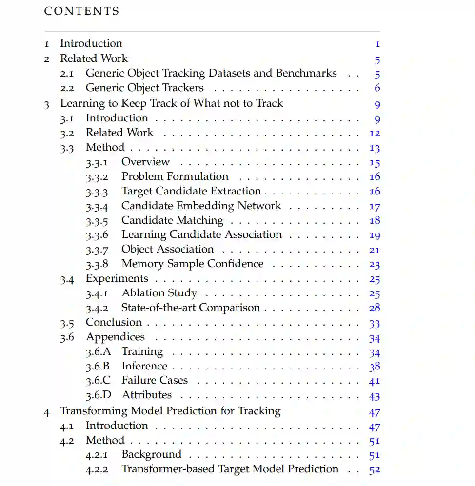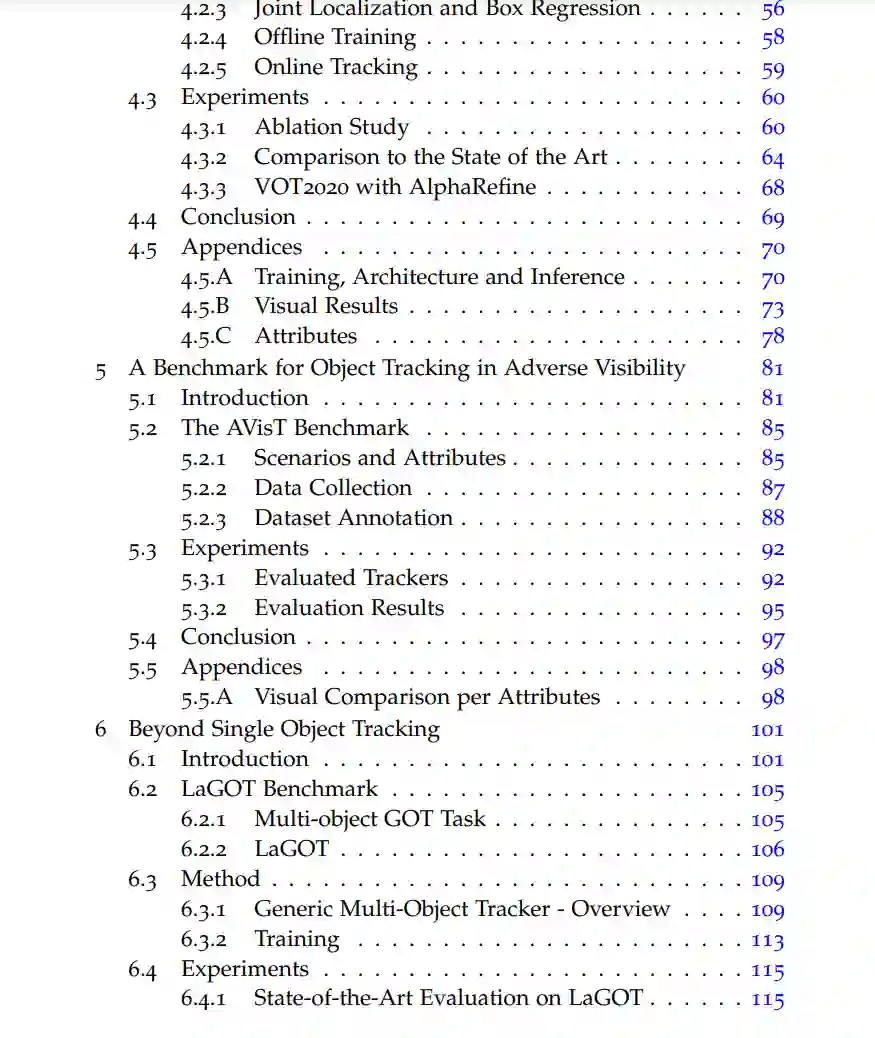 视觉物体跟踪是计算机视觉中的基本问题,并在多种任务中找到应用,如自动驾驶、机器人技术、监视、视频理解和体育分析。通用对象跟踪(GOT)是一种专门的跟踪任务,旨在通过使用用户在初始视频帧中定义目标对象的边界框来跟踪视频中的任何对象。从这样稀疏的信息中学习一个目标模型,以便在每个帧中跟踪目标,证明是极具挑战性的。尤其是在困难的跟踪情境中,目标对象经常被遮挡,走出视线,或者存在与目标视觉相似的干扰物。因此,我们在这篇论文中解决了在困难情境中的视频中鲁棒性地跟踪通用对象的问题。首先,我们提出了一个新的跟踪架构,可以跟踪干扰物以继续追踪目标。我们通过学习一个关联网络来实现这一点,该网络允许从帧到帧传播所有目标候选者的身份。为了解决视觉跟踪中干扰物之间缺乏地面真实对应的问题,我们提出了一种结合部分注释和自监督的训练策略。其次,我们引入了一个基于Transformer的目标模型预测器,用于生成目标模型。所使用的Transformer具有很小的归纳偏见,从而允许其学习对困难序列进行强大的目标模型预测。我们进一步扩展模型预测器,以估计第二组权重,这些权重用于准确的边界框回归。第三,我们提出了一个新的视觉跟踪基准,AVisT,专门用于具有不利可见性的跟踪情境。AVisT包含18种不同的情境,大致分为五个属性,包含42个对象类别。AVisT的关键贡献是多样性和具有挑战性的情境,涵盖了严重的天气条件、遮挡和不利的成像效果,以及伪装。最后,我们提出了多对象GOT的任务,这比在每个视频中仅跟踪一个通用对象具有更广泛的适用性,使其在实际应用中更具吸引力。为此,我们引入了一个新的大规模GOT基准,LaGOT,每个序列都包含多个注释的目标对象。我们的基准允许研究人员解决GOT中的剩余挑战,旨在通过同时跟踪多个对象来增加鲁棒性并减少计算。此外,我们提出了一个基于Transformer的GOT跟踪器,能够通过共享计算同时处理多个对象。