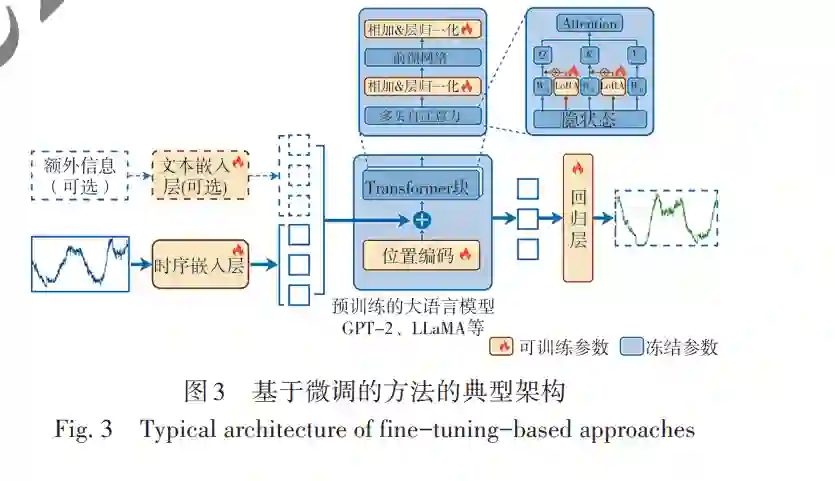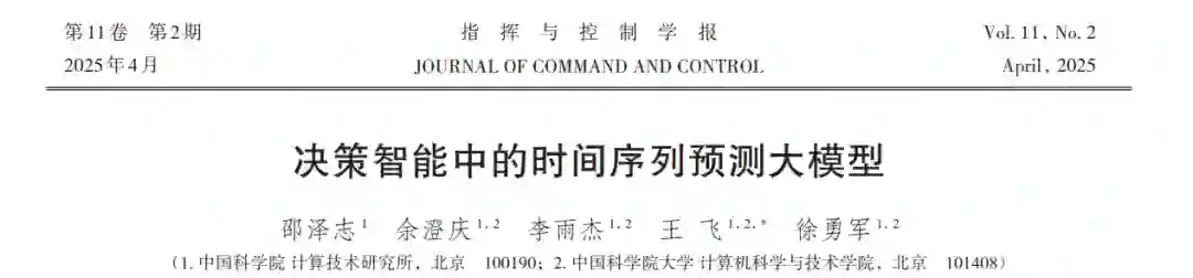 摘 要 不同场景下时序数据的异质性极大地影响了智能决策中时序预测算法的泛化性和有效性,对其应用构成了重要阻碍。 时序预测大模型是解决这一挑战的重要技术。综合了时序预测领域的最新研究动态,从模态视角自上而下地探讨了时序预测大 模型的4种实现思路:基于提示的方法、基于微调的方法、基于对齐的方法以及时序预测基础模型。梳理了时序预测大模型构 建过程中的核心要素和可用技术。探讨了未来的重要挑战和研究方向。 关键词 时间序列,大语言模型,基础模型,预测时序预测技术在智能决策中扮演着重要角色: 通过分析和学习历史数据的模式,准确预测时空系 统的未来态势,可以为复杂系统调度优化和智能决 策提供关键支持。时间序列数据广泛分布于交通、 电力、气象等多种时空系统中,记录了关键观测点 或指标的状态变化,是反映这些系统演变趋势的关 键数据资源。时间序列预测技术致力于通过分析和 学习历史数据的模式,准确预测未来趋势。这种技 术在智能决策中扮演着至关重要的角色:能够准确 预测时空系统的未来态势,从而为有效的调度优化 和智能决策提供关键支持。因此,深入研究时序预 测技术对于战场态势感知、武器系统维护、战场环 境监测等领域至关重要,可以显著提高决策的准确 性和效率,为军事行动提供精确而有力的支持。 长期以来,基于统计模型的时间序列预测算法, 如自回归积分滑动平均(autoregressive integrated mov⁃ ing average,ARIMA)[1] 和指数平滑状态空间模型(ex⁃ ponential smoothing state space model,ETS)[2] ,被广泛 认为是可靠的工具,并在实际应用中得到了认可。 随着深度学习技术的发展,研究者们开发了更为灵 活和强大的模型,这些模型能够挖掘时间序列数据 中的深层价值模式,从而显著提升预测的准确性, 成为学术研究的新趋势。然而,基于深度学习的时 序预测模型通常要求训练和推理阶段使用相同的数 据集[3] ,这限制了它们的泛化能力。一方面,不同领 域的时序数据常常展现出不同的模式,导致模型难以 广泛泛化;另一方面,不同领域数据的质量参差不 齐,如信噪比、历史数据长度以及预测数据长度等, 进一步削弱了模型的跨领域可用性。在军事领域,这 些问题尤为显著,因为军事应用涉及的场景多样(例 如电力、气象、交通等),且具有高对抗性,数据分布 漂移严重,这使得现有的时序预测算法面临挑战。 受到计算机视觉和自然语言处理领域中诸如视 觉 Transformer(vision Transformer,ViT)[4] 、双向编码器 表 示 Transformer(bidirectional encoder representa⁃ tions from Transformers,BERT)[5] 、生成式预训练Trans⁃ former(generative pre-trained Transformer,GPT)[6] 等 预训练大型模型的启发,时序预测大模型日益受到 学术界的关注,并被认为是一个充满潜力的研究方 向[7] 。这些模型的设计目标是解决数据模式异质、数 据质量不一等核心挑战,从而开发出适用于所有领 域的时间序列预测任务的通用模型,处理零样本或 少样本情况下的预测,推动时序预测技术的更广泛 应用和实践。然而,作为一个新兴领域,目前还缺 乏针对时序预测大模型研究思路和可用技术的系统 性分析。大多数现有的综述[8-11] 主要关注于预训练的 大语言模型(例如 GPT[6] 、LLaMA[12)] 在时序预测中的 应用。在其他研究中,文献[13]通过“数据视角”对相 关工作进行了分类和梳理,而文献[7]则通过“方法视 角”对相关工作进行了区分。此外,先前的研究通常 同时概述时间序列、空间数据(如轨迹)等多种类型 的数据,而没有对时序预测任务进行深入挖掘。 本文专注于时序预测任务,全面分析了大量相 关研究,采用自上而下和自下而上两种视角详尽地 综述了时序预测大模型的设计思路和具体技术:1) 自上而下的视角:采用“模态视角”来区分不同的研 究思路,即根据对自然语言和时间序列模态的利用方 式的不同对相关工作进行分类。2)自下而上的视 角:梳理了时序预测大模型构建流程中的共性关键技 术。两个视角结合,既给出了实现时序预测大模型的 多种思路,也梳理了可选择的具体技术。此外,本研 究还探讨了未来可能的重要研究方向。