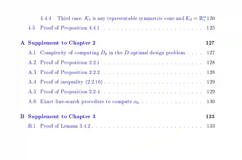 在第三章中,我们为一类凸优化问题提出了一个广义乘法梯度(MG)方法,大致来说,它涉及在对称锥的“切片”上最小化一个1-对数同态函数。这类问题包括了几个重要的应用,包括正电子发射断层扫描、D-最优设计、量子态断层扫描和Nesterov关于布尔二次优化的松弛。我们通过欧几里德Jordan代数的工具展示,这个广义的MG方法以𝑂(ln(𝑛)/𝑘)的速率收敛,其中𝑛表示对称锥的秩。