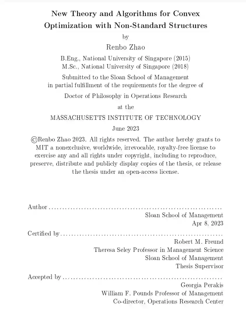 优化模型和算法在科学和工程的发展中长期扮演着核心和不可或缺的角色。近年来,一阶方法在处理机器学习和数据科学中出现的应用时起到了重要的作用,这归因于它们的简单性、合理的快速收敛速度和每次迭代的低计算成本。然而,还存在许多重要的应用违反了现有一阶方法基于的基本假设 —— 具体来说,尽管目标函数是凸的,但在可行域上既不是Lipschitz也没有Lipschitz梯度。这篇论文的目的是为这些“非标准”问题提出新的优化模型,开发新的一阶方法来解决这些模型,并分析这些方法的收敛速度。在第一章中,我们为组合凸优化问题min𝑥∈R𝑛 𝑓(A𝑥) + ℎ(𝑥)提出并分析了一个新的广义Frank-Wolfe方法,其中𝑓是一个𝜃-对数同态自调和障碍,A是一个线性算子,而函数ℎ在其域上有界,但可能是非光滑的。我们证明了我们的广义Frank-Wolfe方法需要𝑂((𝛿0 + 𝜃 + 𝑅ℎ) ln(𝛿0) + (𝜃 + 𝑅ℎ) 2/𝜀) 次迭代产生一个𝜀-近似解,其中𝛿0表示初始最优性差距,而𝑅ℎ是ℎ在其域上的变化。这一结果建立了𝜃-对数同态障碍和Frank-Wolfe方法之间的某种固有联系。当专门用于𝐷-最优设计问题时,我们实际上恢复了Khachiyan (1996)使用带有精确线搜索的Frank-Wolfe方法获得的复杂性。