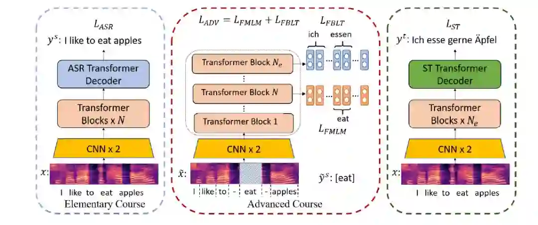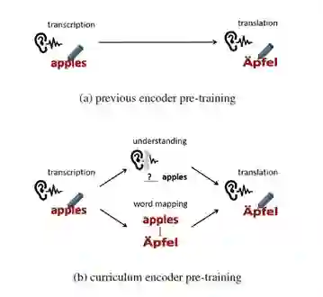 端到端语音翻译(Speech Translation, ST)利用一个神经网络模型将一段源语言语音直接翻译为目标语言的文本。这个任务对模型编码器带来很大负担,因为它需要同时学习语音转录(transcription)、语义理解(understanding)和跨语言语义匹配(mapping)。已有工作利用语音识别(Automatic Speech Recognition, ASR)数据上进行预训练以获得更强大的编码器。然而,这种预训练方式无法学习翻译任务所需要的语义知识。受到人类学习过程的启发,本文提出了一种课程预训练(Curriculum Pretraining)的方式。如图1所示,在学习语音翻译之前,模型首先学习一门基础课程用于语音转录,随后学习两门用于语义理解和单词映射的高级课程,这些课程的难度逐渐增加。
