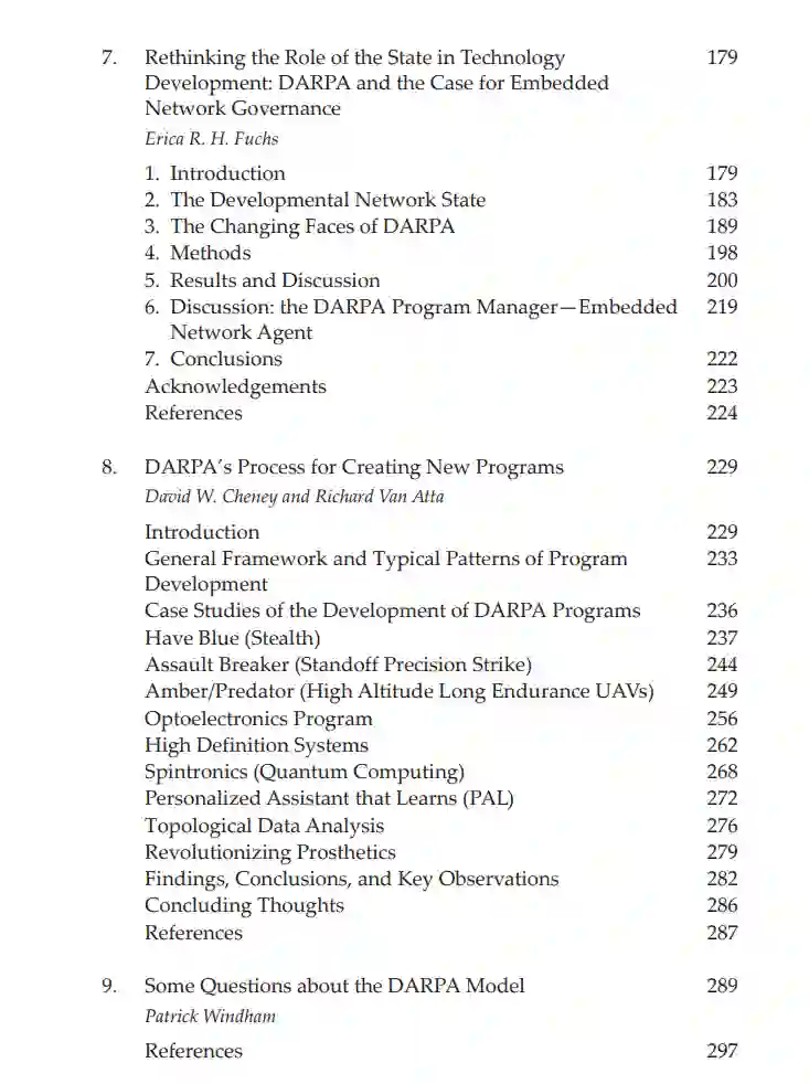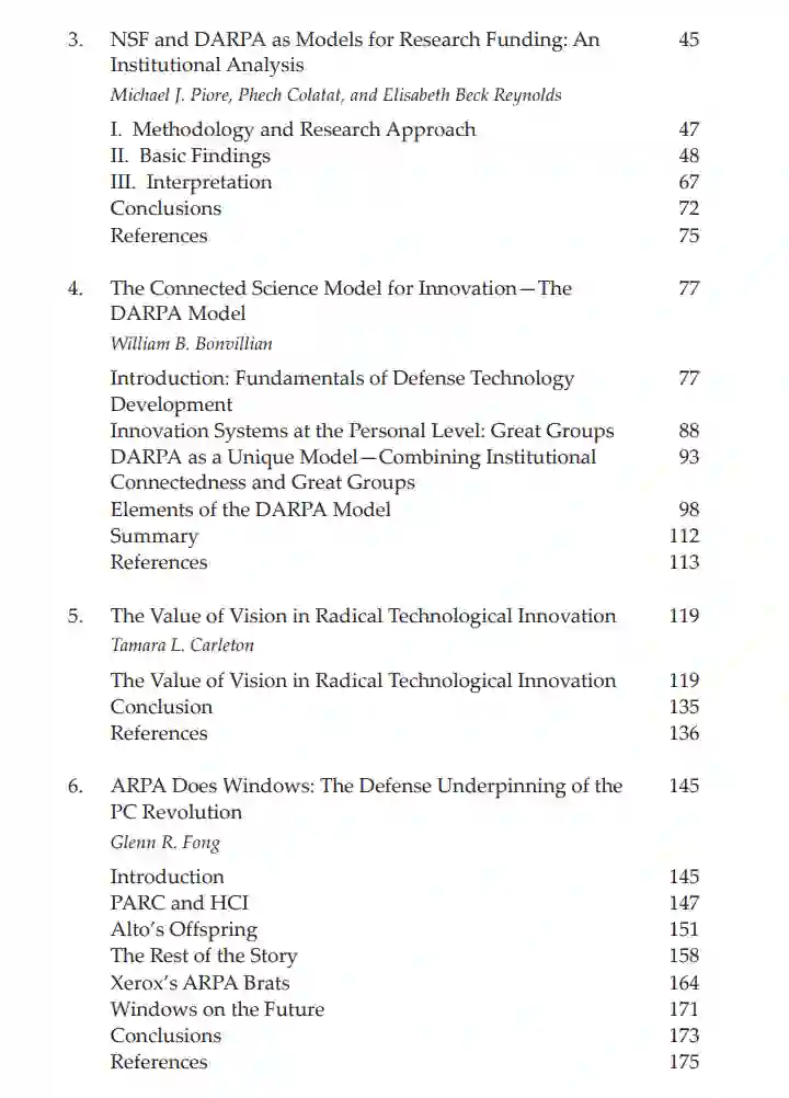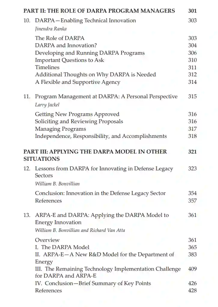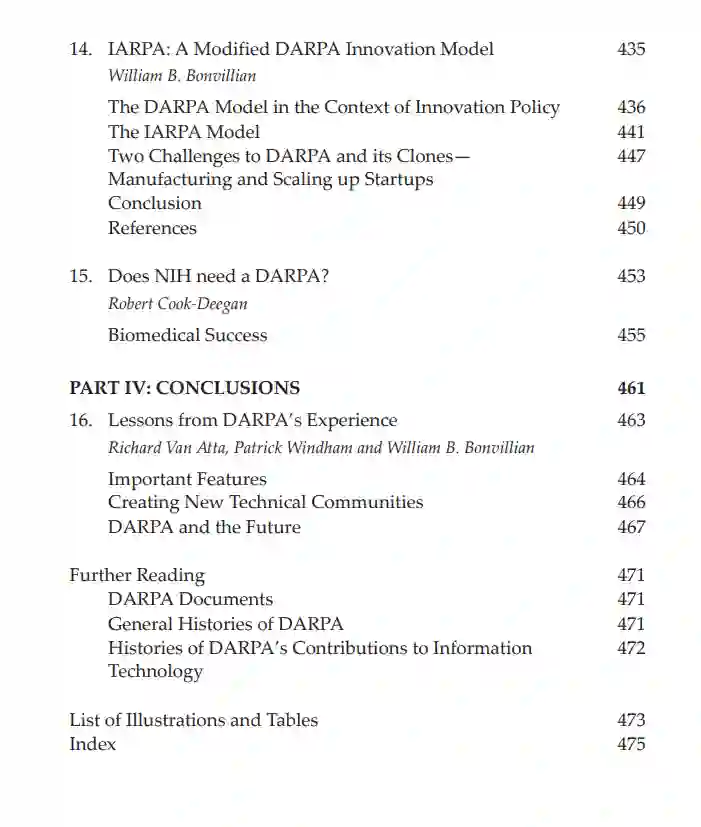 第一部分,“对DARPA的观点”,共有七章。第2章由Richard Van Atta编写,讲述了DARPA的前五十年历史。第3章,由Michael Piore、Phech Colatat和Elisabeth Beck Reynolds共同撰写,比较了DARPA的文化与更传统的联邦研发机构,包括NSF。第4章,由William B. Bonvillian编写,探讨了“DARPA模型”,特别是它如何遵循二战期间开发的方法,将前沿科学与解决具体技术挑战相结合。第5章,由Tamara Carleton编写,讨论了技术愿景在DARPA的运作和成果中的核心角色。第6章,由Glenn R. Fong编写,是关于DARPA资助的发明在个人计算机及其软件发展中的中心作用的历史。第7章,由Erica R. H. Fuchs编写,探讨了DARPA的治理方法作为一个内嵌网络。第8章,由David W. Cheney和Richard Van Atta共同撰写,探讨了DARPA创建新项目的过程,并研究了几个过去DARPA项目的起源。第9章,由Patrick Windham编写,探讨了一系列关于DARPA模型的问题。 第二部分,“DARPA项目经理的角色”,包括第10章和第11章,由两位前DARPA项目经理Jinendra Ranka和Larry Jackel编写。 第三部分,“在其他情境中应用DARPA模型”,包含两章。第12章,由William B. Bonvillian编写,探讨了DARPA创新模型为国防部其他较旧的“遗产部门”提供的教训。第13章,由William B. Bonvillian和Richard Van Atta共同撰写,探讨了领导者如何有效地将DARPA模型应用于(当时)相对较新的高级研究项目局-能源(ARPA-E),以及来自ARPA-E本身的组织教训。第14章,由William B. Bonvillian编写,讨论了IARPA,另一个DARPA克隆机构。第15章,由Robert Cook-Deegan编写,探讨了将DARPA模型应用于国家卫生研究院(NIH)的可能性。第四部分,“结论”,由Richard Van Atta、Patrick Windham和William B. Bonvillian共同编写的第16章组成,总结了从DARPA的经验中如何构建一个成功创造新颖、创新技术的组织的关键教训。 这些各个章节在某种程度上有所重叠。然而,本书的编辑希望它们共同为读者提供了关于这个卓越的政府机构是如何运作的,以及为什么它能够取得如此出色的成功的全面见解。
