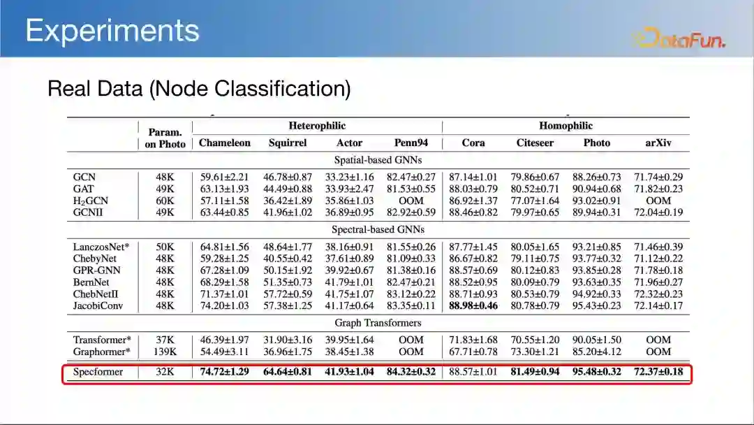 我们还验证了其知识迁移能力,即在一个领域做训练,在另一个领域做预测。从上图中可以看到,计算机与材料、工程、化学的相关性是比较强的,但与艺术领域的关联性是很弱的,是负关联。通过知识迁移实验发现,结构相关的情况下知识迁移会表现较好。结构越相关,知识迁移能力的提升越明显。这也说明了结构知识的迁移是一件很困难的事情。2. Specformer (ICLR 2023)