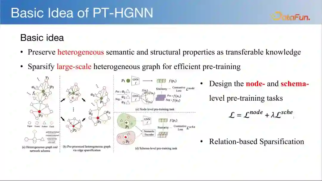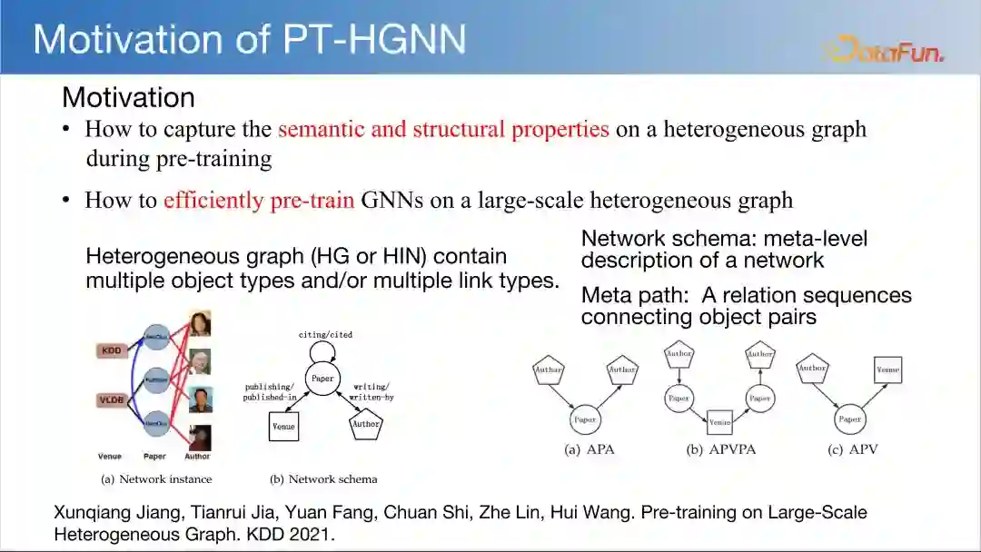 PT-HGNN 的动机在于如何对异质图进行预训练,以保留其结构和语义特性,用于对大规模图数据的处理。异质图是包含不同类型节点和边的图结构,能够更精准地刻画复杂交互系统。网络模式(network schema)是对图中节点间交互模式的一种描述。元路径(meta path)是指连接两个节点的关系序列,揭示了节点间是通过何种路径在图中进行连接的。在异质图领域,我们已开展了大量工作,并在工业界取得了良好的应用效果。如果对这部分内容感兴趣,可以查阅相关材料。