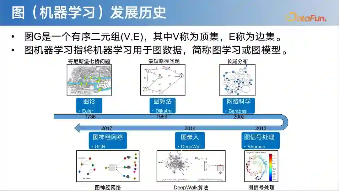图或网络,作为一种通用语言,用于描述和建模复杂系统。在系统中,点和边代表各种交互关系。无论是社交网络、金融网络还是生物医药网络,只要存在点与边之间的交互,我们都可以运用图进行建模。简言之,图是一种强大的工具,能够帮助我们理解和分析复杂系统中各元素之间的相互作用。 5. 图(机器学习)发展历史****