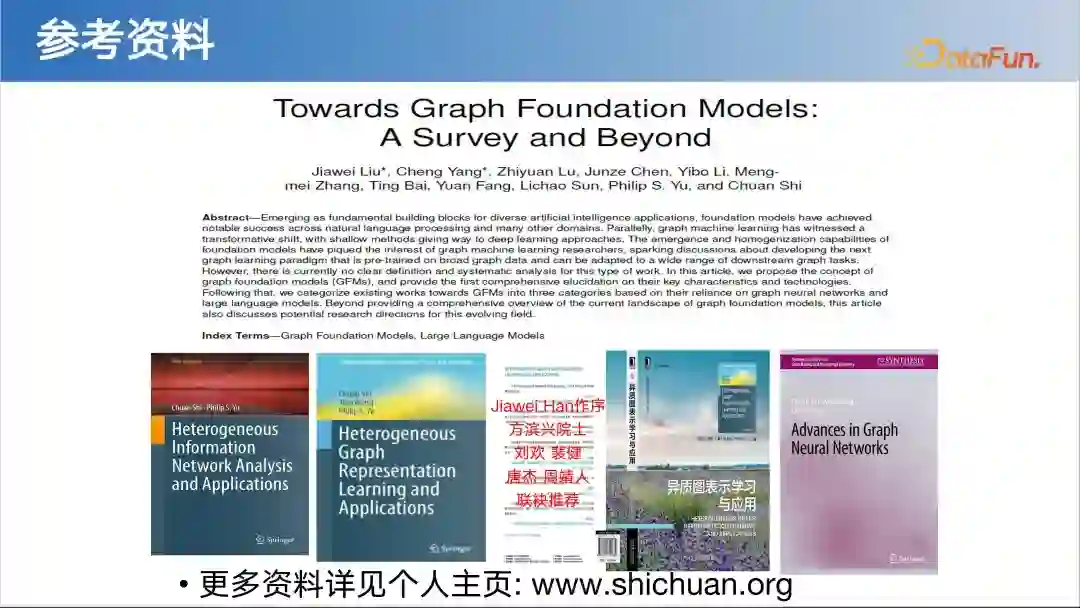 总结与展望我们在图机器学习方面做了非常多的工作,对学习机制、不同类型数据、如何增强鲁棒性、可信性等方面进行了深入研究和大量探索,并尝试将图神经网络应用到安全和推荐等领域,在很多实际业务中取得了很好的效果。关于图基础模型,我们发表了一篇文章,欢迎大家阅读。 目前,图基础模型还是一个比较新的概念,未来仍有广泛的探索空间。主要的一些研究方向包括: 1. 提升数据量与数据质量