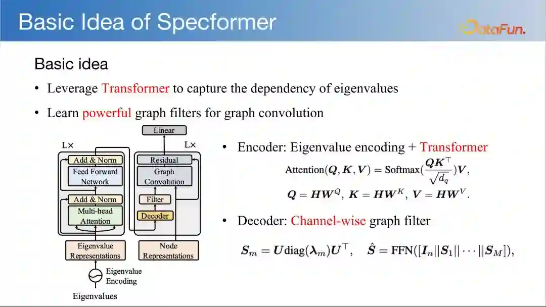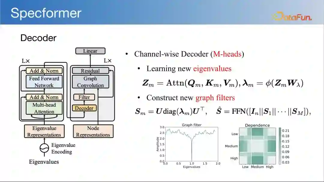 Specformer 的基本思想是利用 Transofrmer 刻画特征值之间的依赖,学习一个表达能力强的图滤波器,用于图卷积。图神经网络通常利用图的拉普拉斯矩阵的特征值和特征向量来捕获图的全局结构信息,而 Transformer 通过自注意力机制能够处理长距离依赖关系。特征值编码:Specformer 通过特征值编码(Eigenvalue Encoding)来捕捉图的谱信息。这一步骤将图的拉普拉斯矩阵的特征值转换成相对信息,为后续的 Transformer 编码器提供输入。Transformer 编码器:利用 Transformer 编码器来处理经过编码的谱信息。Transformer 编码器能够处理排列不变的特性,并且可以通过自注意力机制捕捉不同特征值之间的依赖关系。通道级解码器:Specformer 引入了一个通道级解码器(Channel-wise Decoder),它不仅学习新的特征值,而且构建新的图滤波器(Graph Filters)。这些图滤波器能够用于图卷积操作,增强模型对图结构的捕捉能力。图卷积的改进:通过学习到的图滤波器,Specformer 能够执行更复杂的图卷积操作,这可能提高图神经网络在各种图任务上的性能。端到端学习:Specformer 支持端到端的学习,即模型可以从原始图数据中自动学习到有用的特征表示,而不需要手动设计特征。
