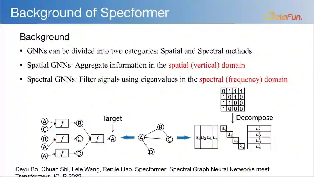 图神经网络可以分为两大类:空域(spatial)和谱域(spectral)。Spatial GNNs:在图神经网络的上下文中,空间域通常指的是图的几何结构或拓扑结构,即节点的连接方式。Graph Transformers 通过考虑节点的邻居信息来工作,这本质上是在图的结构空间上进行操作。Spectral GNNs:谱域指的是利用图谱的特性,如拉普拉斯矩阵的特征值和特征向量,来分析和处理图数据。