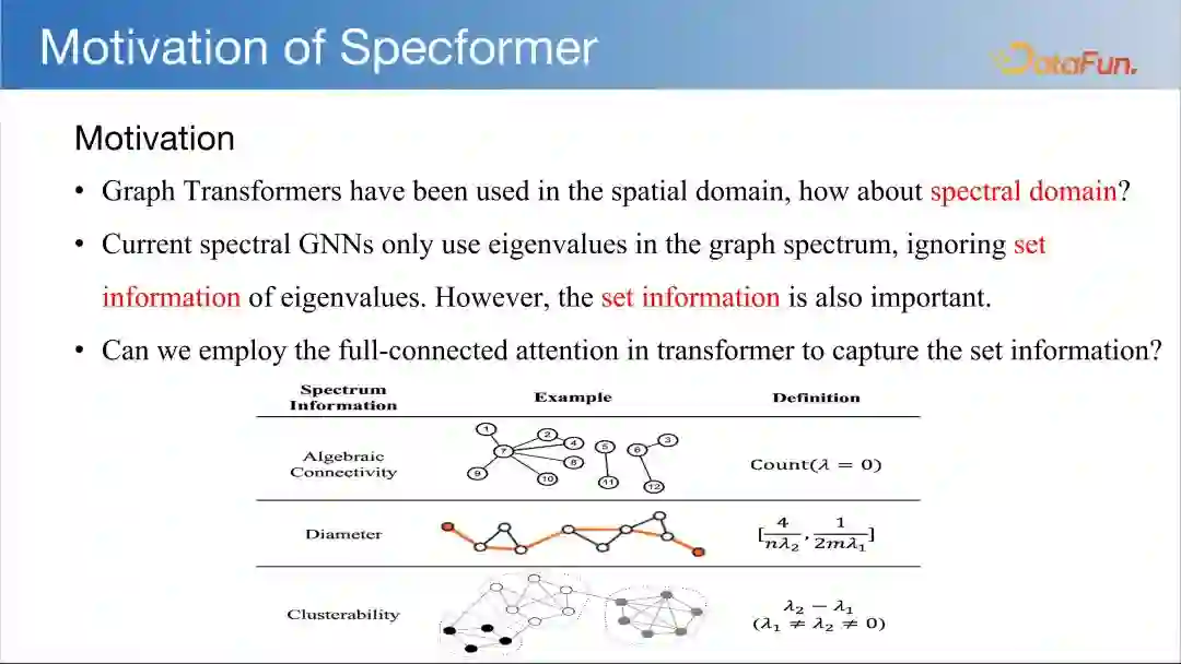 Graph Transformer 已经应用于空域中,还未用于谱域。目前的谱域 GNN 仅使用图谱中的特征值,忽略了特征值的集合信息,但集合信息也是很重要的。因此我们希望能够利用 Transformer 中的全连接注意力来捕获集合信息。