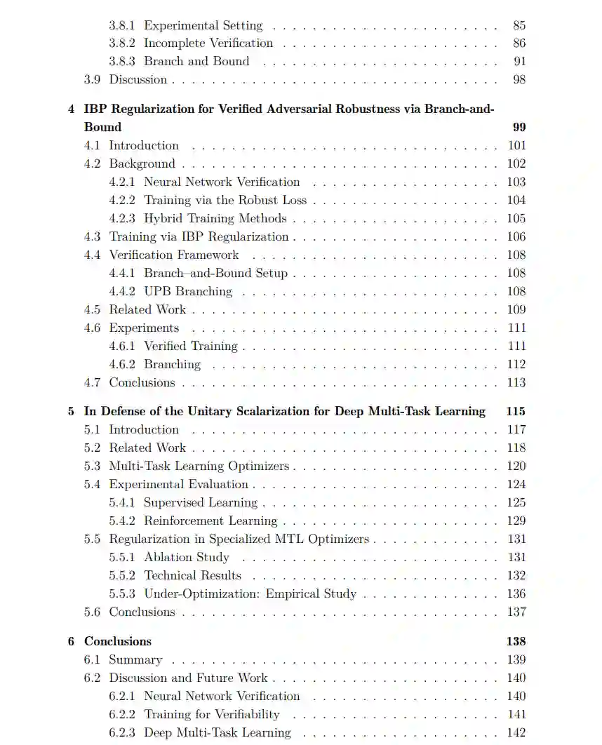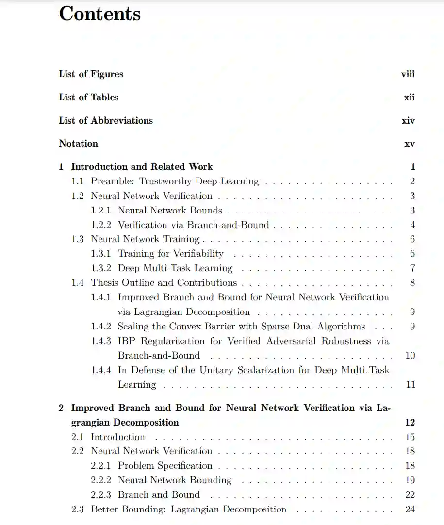 在过去的几年里,神经网络在各种备受关注的应用中取得了显著的性能,从蛋白质折叠(Senior等人,2020;Jumper等人,2021)到快速矩阵乘法(Fawzi等人,2022)。由于这些成就的宣传,基于神经网络的系统现在常常出现在主流信息媒体中(Geddes,2022;Larousserie,2022;Iannaccone,2022),这导致了媒体曝光率的持续增加。直接的结果是,人们对机器学习算法的可信度产生了极大的兴趣(Varshney,2022)。特别的,人们的努力已经朝着确保神经网络的公平性(Du等人,2020),可解释性(Angelov和Soares,2020),鲁棒性(Carlini和Wagner,2017)和隐私性(Abadi等人,2016)方向发展。深度学习在计算机视觉方面的进展(Krizhevsky等人,2012;Voulodimos等人,2018)尤其迅速,其中已经在标准化任务上取得了超过人类的性能(O’Mahony等人,2019)。然而,对敌对性例子的发现(Szegedy等人,2014;Goodfellow等人,2015),即人类无法察觉的扰动可以显著改变网络预测,对这种进步的基础产生了严重的质疑。因此,越来越多的注意力开始致力于提供关于神经网络行为的正式保证(Liu等人,2021b)。此外,人们注意到深度学习的实践常常基于民间观察和固定的流程,而不是对正在使用的复杂算法的严谨理解(Sculley等人,2018;Hutson,2018)。幸运的是,有许多工作试图提供对预先存在的算法的全面评估(Greff等人,2017;Lucic等人,2018),常常揭示了更简单基线的竞争性能(Brockschmidt,2020;Narang等人,2021)。 在这篇论文中,我们通过开发或为神经网络验证和训练的高效算法提供支持,向可信任的深度学习迈进一步。在概述这篇论文中提出的各项贡献(§1.4)之前,我们现在将介绍神经网络验证(§1.2)以及我们感兴趣的背景下的神经网络训练(§1.3)。