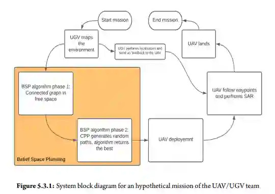 为了解决其中一些挑战,本工作提出的方法建议使用无人地面车辆上的主动传感器来定位无人机,这种方式不易漂移,且适用于各种光照条件。采用这种无人机/无人地面车辆组队配置,无人地面车辆具有额外负载能力和更长续航的优势,便于携带许多感知传感器以及近乎实时使用它们所需的显著计算能力。在此场景下,无人地面车辆用于测绘环境以及估计无人机在地图中的状态,同时利用无人机的机动性执行搜索任务。然而,采用这种方法时,由于无人地面车辆感知传感器的不确定性本质以及传感器视场可能不重叠,无人机的定位不确定性受所选飞行路径影响。因此,本论文部分内容致力于开发一种无人机的路径规划算法,该算法同时考虑勘探需求和无人机的定位不确定性。