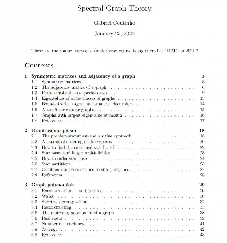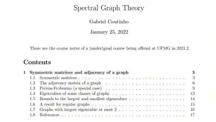 谱图理论就是研究如何通过几个容易计算的定量来描述图的性质。通常的方法是将图编码为一个矩阵然后计算矩阵的特征值。来自Gabriel Coutinho的最新谱图理论笔记。