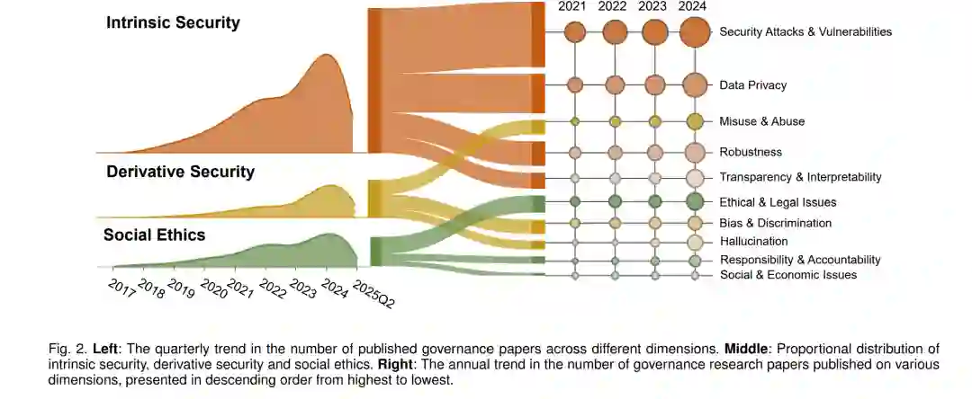 我们的综述围绕 AI 治理的三大支柱展开,即内生安全、衍生安全与社会伦理。具体而言(参见图 1):内生安全研究保持持续增长,尤其是在对抗性漏洞、模型鲁棒性与透明性方面。安全攻击与漏洞研究的论文数量从 2021 年的 230 篇增加到 2024 年的 353 篇,鲁棒性研究也呈类似上升趋势,反映了人们对对抗操纵与敏感数据保护的日益关注。尽管透明性与可解释性相关研究发表数量较少,但自 2017 年以来保持稳定,显示出学界持续探索理解与审计 LLM 行为的努力。相比之下,衍生安全(如隐私与虚假信息)在近几年获得了更快的关注增长。例如,虚假信息问题在 2021 年前几乎未被关注,但相关论文数量在 2024 年急剧上升至 249 篇,体现了提升 LLM 输出可信度的现实紧迫性。在社会伦理方面,偏见、责任与问责等主题的研究也在逐渐增多,显示其受到的关注度不断提升。 本文的剩余部分安排如下:第 2 节介绍 AI 治理的背景及其与 AI 安全的关系,强调其关键动机与基础原则;第 3 节讨论内生安全,包括对抗性漏洞、鲁棒性、幻觉与可解释性问题;第 4 节探讨衍生安全,重点关注隐私风险、偏见与歧视,以及滥用与误用问题;第 5 节涉及社会伦理,包括社会与经济影响、伦理与法律问题,以及责任与问责机制;第 6 节总结开放挑战与未来方向,包括技术缺口、监管与伦理考量以及研究机会;最后,第 7 节对本文进行总结。