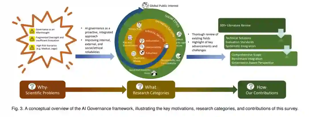 这项多维度的综述为研究人员、工程师与政策制定者提供了可操作的洞见,帮助他们构建不仅稳健可靠,而且具备社会责任感与伦理对齐的 AI 系统,其整体结构如图 3 所示。 本研究的贡献总结如下: * 全面性:从技术视角对 AI 治理进行统一且系统的综述,涵盖内生安全(如对抗攻击、幻觉)、衍生安全(如隐私、偏见)与社会伦理(如伦理与法律问题)。 * 基准整合:整理并对比了相关的最新评测基准(如鲁棒性、幻觉、公平性与滥用检测等基准),促进治理相关主题的可复现研究与标准化评估。 * 治理导向视角:融合技术方法与社会及政策视角,推动 AI 系统设计与透明性、问责性及安全性等原则保持一致的治理框架发展。