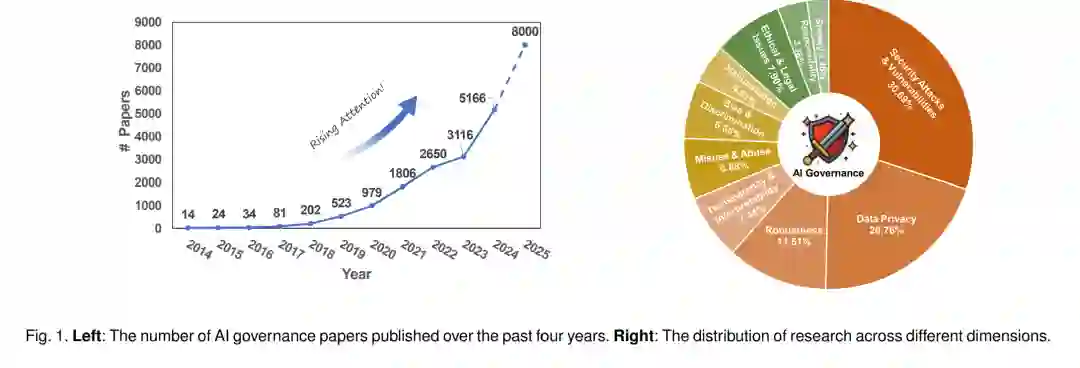 人工智能(AI)的快速发展,尤其是大型语言模型(Large Language Models, LLMs)的出现,正在推动科学 [1]、工业 [2] 和社会 [3] 发生深刻变革。这些模型如今已支持从教育、医疗到法律与公共服务等广泛的应用场景,并在推理 [4]、内容生成 [5] 和决策支持 [6] 等方面展现出前所未有的能力。 然而,伴随这些进步而来的,是一系列与传统软件系统根本不同的新型安全与可靠性挑战。这些挑战包括对抗性脆弱性 [7]、幻觉问题 [8] 以及输出偏差 [9] 等,而这些问题可能被恶意利用并造成严重后果。例如,LLM 可能通过提示注入(prompt injection)被操纵以绕过内容过滤,从而生成有害或非法的建议 [10]。由生成模型驱动的深度伪造(Deepfake)技术 [11] 可能被用于虚假信息传播或非自愿图像生成,侵蚀公众信任与隐私。在医疗场景中,错误的 AI 生成诊断甚至可能导致错误的临床决策,从而危及生命 [12]。这些案例凸显了一个重要事实:AI 系统带来的风险已不再是理论假设——它们正在大规模地影响个人、社区和机构。 针对这些风险,“AI 治理”概念应运而生,作为一个多学科框架,旨在确保 AI 系统不仅在技术上稳健可靠,而且在伦理上对齐、法律上合规,并对社会有益 [13]。AI 治理涵盖了贯穿 AI 全生命周期的规则、实践与技术 [14],旨在将透明性、问责制与公平性等原则嵌入系统设计,并在真实部署中推动公众监督与价值对齐。与将安全视为事后附加措施不同,AI 治理提倡对 AI 风险进行前瞻性、集成化管理 [15]。 更重要的是,AI 治理不仅仅是 AI 安全的延伸 [16]。AI 安全侧重于系统层面的稳健性,确保模型在分布偏移、对抗攻击或数据噪声下依然表现可靠;而治理的视野更为广阔,关注 AI 部署过程中的社会、伦理与制度层面。它涵盖了衍生风险,如隐私侵犯、虚假信息传播与算法歧视,同时引入法律责任、利益相关方问责机制与伦理审议等手段。因此,治理在技术与社会领域之间架起了桥梁,提供了一种既强大又可被负责任地控制的 AI 构建路径。 如图 1 所示,对相关文献的时间分布分析揭示了 LLM 治理研究领域的演化趋势。2017—2024 年间,该领域的学术关注度显著上升,尤其是 2020 年之后。预计到 2025 年底,相关学术论文数量将超过 8,000 篇,显示出 LLM 在现实应用中的快速部署已经引发了对其治理的迫切讨论。 尽管 AI 治理在学界、产业界和政策领域获得了越来越多关注,但一个能够跨越这些领域、系统整合且技术扎实的综合性综述仍然明显缺失。现有研究 [17], [18] 往往将技术安全与更广泛的治理问题割裂开来,或仅聚焦于特定风险(如公平性或对抗鲁棒性),缺乏统一的框架。同时,另一类主要源于伦理与法律研究的成果,虽然提供了高层次的规范性分析,但很少涉及新兴的实证评估方法、标准化基准与系统级防御手段 [18]。因此,迫切需要一篇综合性综述,以全面描绘 AI 治理的整体格局,并将其置于当代 AI 系统快速演进的背景之中。