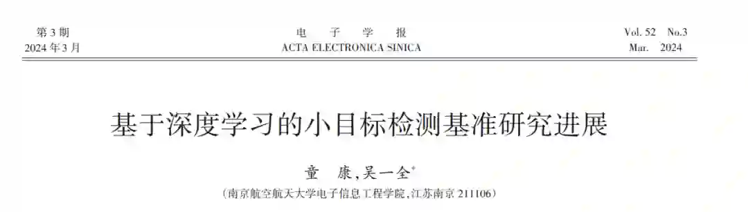 小目标检测是计算机视觉中极具挑战性的任务.它被广泛应用于遥感、交通、国防军事和日常生活等领域.相比其他视觉任务,小目标检测的研究进展相对缓慢.制约因素除了学习小目标特征的内在困难,还有小目标检测基准,即小目标检测数据集的稀缺以及建立小目标检测评估指标的挑战.为了更深入地理解小目标检测,本文首次对基于深度学习的小目标检测基准进行了全新彻底的调查.系统介绍了现存的35个小目标数据集,并从相对尺度和绝对尺度(目标边界框的宽度或高度、目标边界框宽高的乘积、目标边界框面积的平方根)对小目标的定义进行全面总结.重点从基于交并比及其变体、基于平均精度及其变体以及其他评估指标这3方面详细探讨了小目标检测评估指标.此外,从锚框机制、尺度感知与融合、上下文信息、超分辨率技术以及其他改进思路这5个角度对代表性小目标检测算法进行了全面阐述.与此同时,在6个数据集上对典型评估指标(评估指标+目标定义、评估指标+单目标类别)下的代表性小目标检测算法进行性能的深入分析与比较,并从小目标检测新基准、小目标定义的统一、小目标检测新框架、多模态小目标检测算法、旋转小目标检测以及高精度且实时的小目标检测这6个方面指出未来可能的发展趋势.希望该综述可以启发相关研究人员,进一步促进小目标检测的发展.
