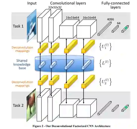 我们的主要贡献是反卷积因子卷积神经网络(DFCNN)。DF-CNN框架调整了标准卷积神经网络(CNN)框架,以实现任务之间的转移。它在每个CNN层维护一个共享知识库,并通过这个共享知识促进不同任务的CNN之间的转移。每个具体任务的CNN模型的各个过滤层都是由这个共享知识库重建的,随着网络在多个任务中的训练,这个知识库会随着时间的推移而调整。DF-CNN代表了ELLA终身学习框架对深度网络的概括。