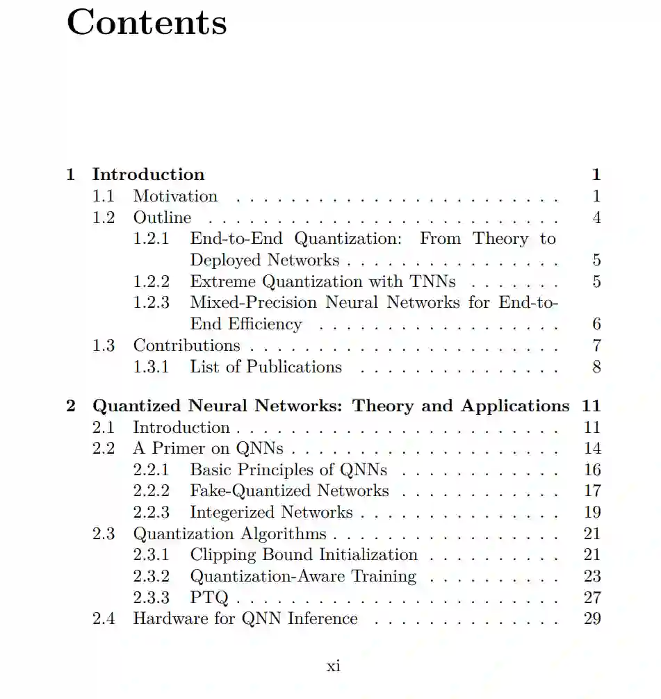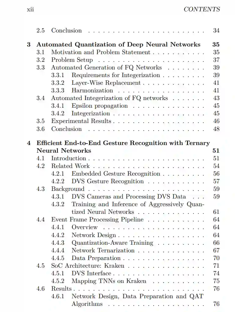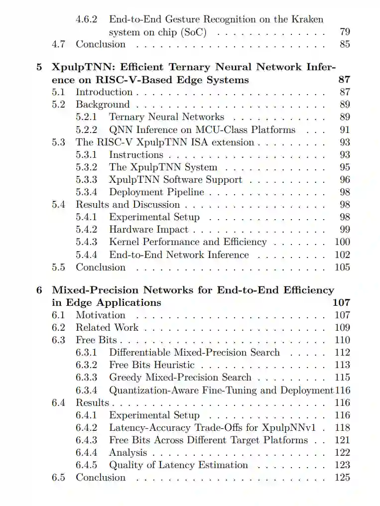 为了高效评估不同量化策略对端到端应用能效的影响,我们首先提出了一种将全精度网络自动转换为可训练和可部署的纯整数量化对应物的方法。然后,我们探讨了极端量化(如三值神经网络,TNNs)的现实潜力。通过动态视觉传感器数据的端到端手势识别示例,我们展示了基于TNN的处理流水线在精度和能效方面的最新成果。接下来,我们提出了特定于TNN的RISC-V指令集架构(ISA)扩展,在硅面积和功耗几乎没有增加的情况下,使实际基准网络的吞吐量提高了40%。 虽然极端量化在能效提升方面最具潜力,但在更具挑战性的任务上会带来显著的精度损失。为了优化网络的统计性能和端到端推理能效之间的权衡,我们提出了一种方法,针对特定网络和硬件目标平台,找到延迟优化的逐层混合精度量化策略,在微控制器级平台上,在1000类ImageNet数据集上实现了与全精度等效的分类精度,同时端到端推理延迟降低了多达30%。