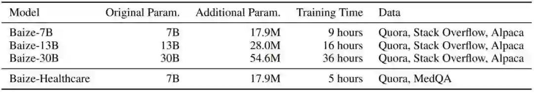在取得这些数据后,作者使用 LoRA(low-rank adaptation)方法在英伟达 A100 单卡下训练了三种尺寸的白泽模型,最短训练时长只需要 5 小时(医疗模型),最长也只需要 36 小时(30B 通用对话模型)。训练的权重最大也仅有 54.6M 的参数量。