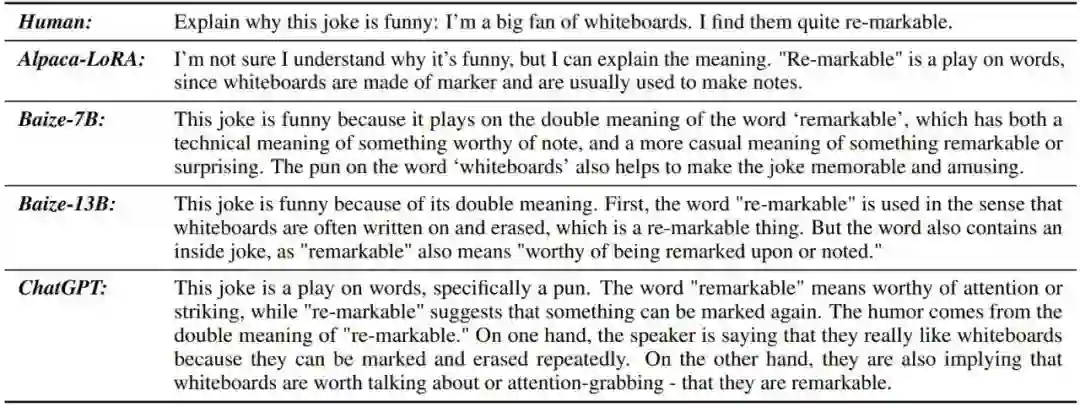 表 6:解释笑话的示例。Baize-13B 和 ChatGPT 可以成功解释这个笑话,Alpaca-LoRA 未能做到。