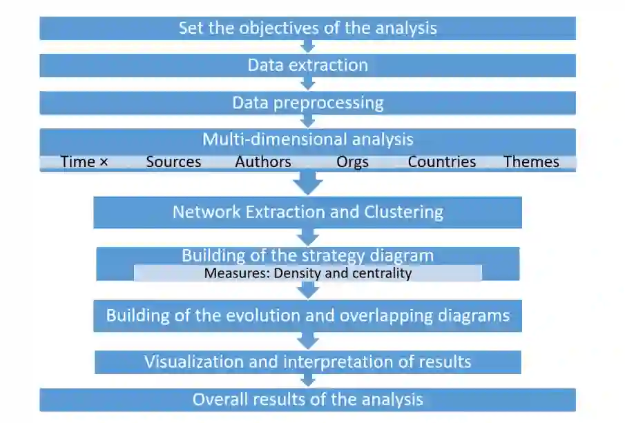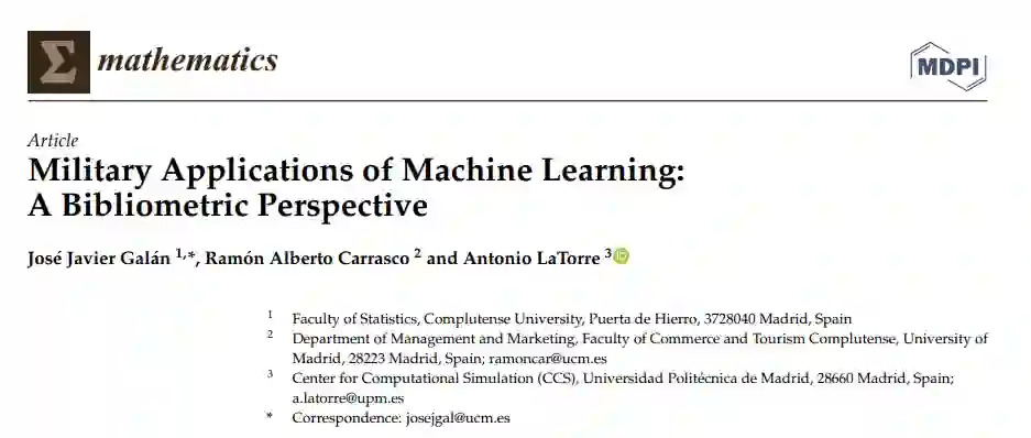 在开展这项工作的同时,正如我们将在第2节中看到的,我们研究了相关工作,注意到在这一新兴主题中很少有综述工作,这引起了我们对对主要科学数据库之一Web of Science进行到2021年及包括2021年的文献计量分析的兴趣。在本节中,我们还提出了一个概念架构,以一种实际的方式在非军事组织中应用ML,因为在军事领域中没有反映这种架构的作品。本工作中使用的文献计量方法在第3节中解释,我们将主要使用SciMat文献计量分析工具,能够在一个纵向框架[5]中执行科学的绘图分析。通过这一分析,我们建立了一个战略图,其中我们确定了ML应用于军事领域的主要领域。在第4节中,我们应用所描述的方法来根据起源进行分析:我们看到了ML应用于军事世界的主要科学领域; 在第5节中,一旦完成了文献计量分析,我们现在可以重新定义第2节中提出的概念架构,特别是针对军事组织。最后,我们得出了一些结论,其中我们揭示了所获得的结果与发现的主要主题领域和结论。