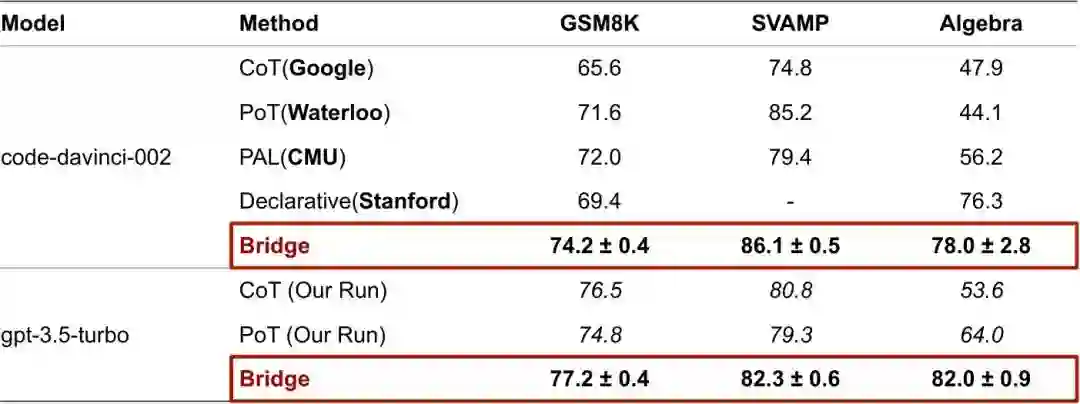为了验证我们“基于方程的数值推理增强方法”(Boosting numerical ReasonIng by Decomposing the Generation of Equations, Bridge)的有效性,我们在GSM8K和SVAMP上进行了实验,这是两个主流的验证大模型数值推理能力的数据集。 表1 主实验 我们的方法相对基于程序的方法,在实验数据集上平均提高了2.6%,均取得了SOTA结果(如表1所示),证明了我们方法的有效性。