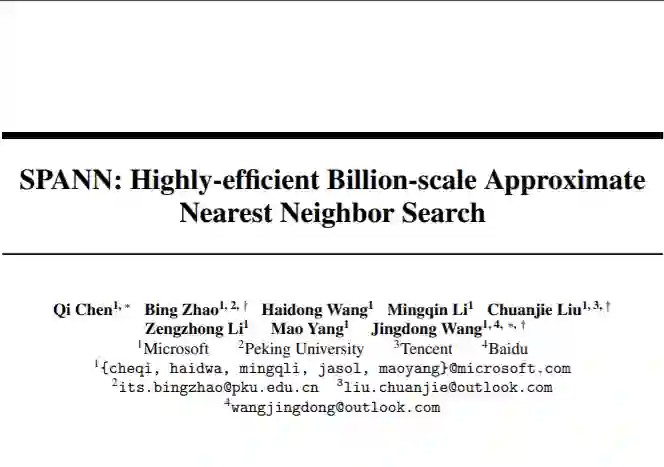 论文摘要:随着数据规模的快速增长,基于内存的向量搜索面临着海量且非常昂贵的内存需求,人们对小内存-大硬盘混合型向量近似最近邻搜索的需求也越来越迫切。因此,研究员们提出了一种非常简单且高效的基于倒排索引思想的内存-硬盘混合型索引和搜索方案 SPANN,有效地解决了倒排索引方法中的三个会导致高延迟或者低召回的难题。实验结果显示,SPANN 在多个上亿量级数据集上都能取得两倍多的加速达到 90% 召回率,其查询延迟能够有效地控制在一毫秒左右。同时, SPANN 的设计能够有效地被扩展到分布式搜索中限制每个查询的资源开销和延迟大小,从而实现高可扩展性。目前 SPANN 已经被部署在了微软必应搜索中支持百亿量级的高性能向量近似最近邻搜索。