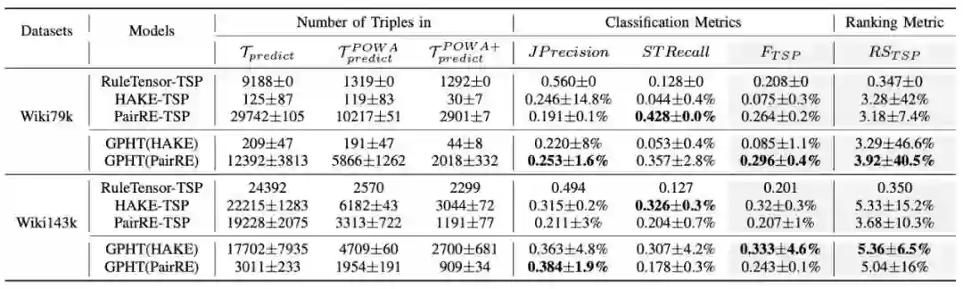 为了验证三元组集合预测任务的可行性和效果,我们从Wikidata中抽取了2个大小不一的数据集(Wiki79k和Wiki143k),进行了基于关系相似性的部分开放世界假设的实验,还构建了一个相对完整的亲属关系知识图谱数据集CFamily,进行了基于封闭世界假设的实验。为了进行实验对比,我们提出了两种基线方法,RuleTensor-TSP和KGE-TSP,将已有的基于规则的和基于嵌入的知识图谱补全方法应用于三元组集合预测任务。Wiki数据集上的实验效果如下: