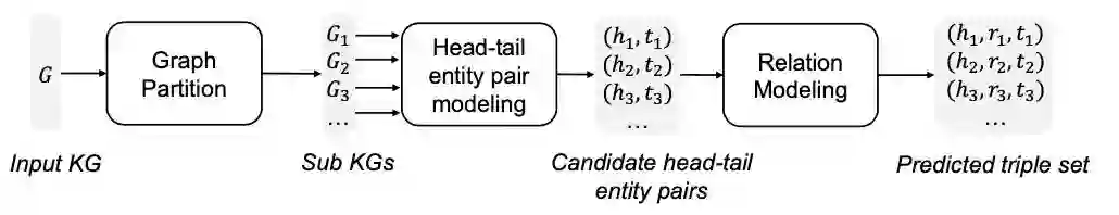 理论上,由已知实体和关系构成的不在知识图谱中三元组,都是候选的缺失三元组,个数为实体个数实体个数关系个数-已知三元组个数,因此三元组集合预测方法最大的挑战是缺失三元组的候选集很大。为了应对这个挑战,我们提出了一个基于图分割和头尾实体建模的方法GPHT,流程如下图所示: