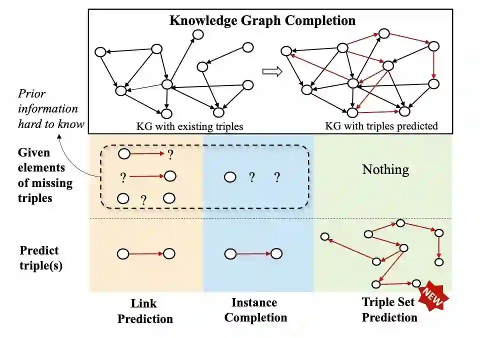 如上图所示,与已有的链接预测和实例补全任务不同,三元组集合预测任务假设被预测三元组的头实体、关系、和尾实体均为未知的,任务定义为:给定一个知识图谱中已知的三元组集合,预测该知识图谱中缺失的三元组集合。