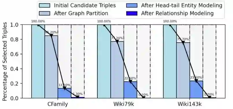 从实验表格中我们可以看出,TSP任务的数值在一个合理的区间,说明了这个新任务的可行性。GPHT方法总体比基线方法效果好。 为了验证GPHT方法每一步的有效性,下图展示了经过每个步骤后所剩的候选三元组个数: 从图中我们可以看出,GPHT的3个核心步骤都有效地减少了候选三元组个数,并最终有效地从大量的候选三元组中筛选出了可能的缺失三元组。