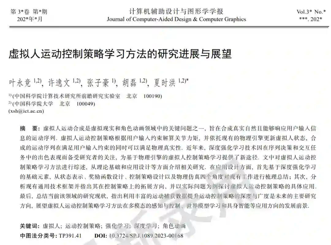 摘要: 虚拟人运动合成是虚拟现实和角色动画领域中的关键问题之一, 旨在合成真实自然且能响应用户输入信息的运动序列. 虚拟人运动控制策略根据用户输入约束解算关节力矩, 并依托现有的物理引擎更新虚拟人状态, 合成的运动序列在满足用户输入约束的同时可以满足物理真实性. 近年来, 深度强化学习技术因其在序列决策和交互任务中的出色表现而备受研究者的关注, 为基于物理引擎的虚拟人控制策略学习提供了新途径. 首先回顾了虚拟人建模仿真和强化学习的理论基础, 以及应用于单一虚拟人运动控制策略学习的主流深度强化学习算法. 其次, 基于强化学习基本元素, 介绍了虚拟人运动控制问题研究工作的应用设计. 最后, 总结了当前研究现状与面临的挑战, 展望虚拟人运动控制策略学习方法的未来发展趋势.
