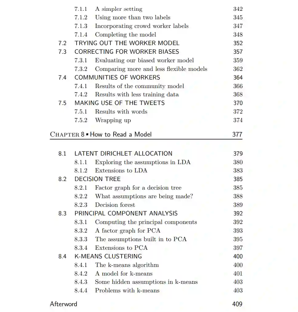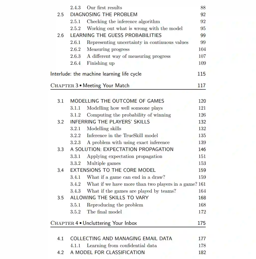 如今,机器学习已广泛应用于各个领域和众多问题。在进行机器学习时,一个基本挑战是将特定机器学习技术的抽象数学与具体、现实世界的问题相结合。本书通过基于模型的机器学习方法来解决这一挑战。基于模型的机器学习专注于理解编码假设以及其对系统行为影响的于现实情境中假设从算法所需详细数学中分离出来,使得更容易理解。有关基于模型的机器学习是什么以及它如何帮助解决问题,请参阅名为“机器学习如何解决我的问题?”介绍章节获取更多详细信息。本书独特之处在于不回顾算法或技术类别,而是通过案例研究介绍所有关键思想,并涉及到现实世界应用程序。案例研究在讨论建模假设时起着核心作用,因为只有在应用程序上下文中才能有意义地讨论它们。每个案例研究章节都介绍了一个现实世界应用,并使用基于模型的方法来解决该问题。此外,第一个教程章节探讨了一个虚构谋杀谜团问题。