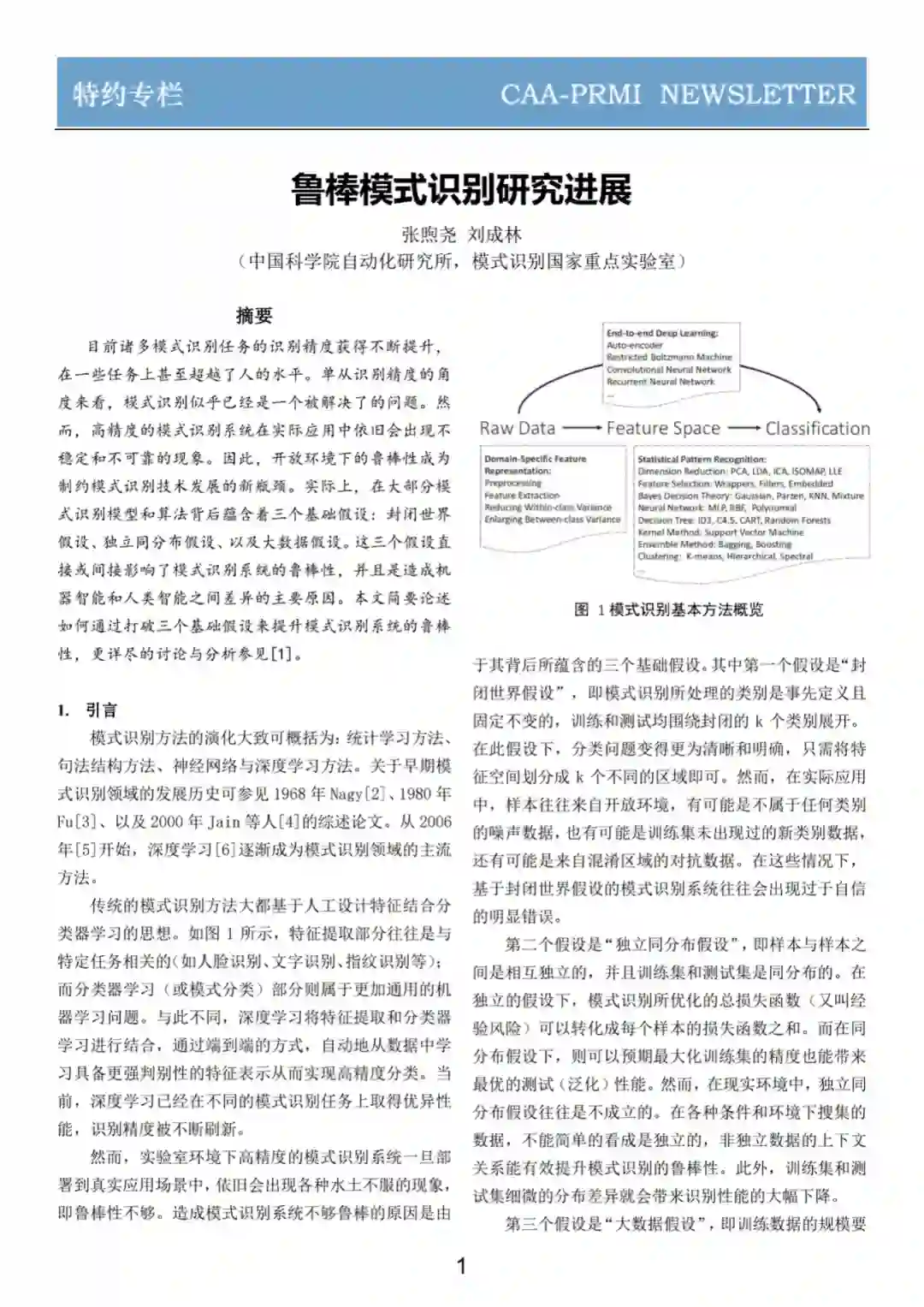 目前诸多模式识别任务的识别精度获得不断提升,在一些任务上甚至超越了人的水平。单从识别精度的角度来看,模式识别似乎已经是一个被解决了的问题。然而,高精度的模式识别系统在实际应用中依旧会出现不稳定和不可靠的现象。因此,开放环境下的鲁棒性成为制约模式识别技术发展的新瓶颈。实际上,在大部分模式识别模型和算法背后蕴含着三个基础假设:封闭世界假设、独立同分布假设、以及大数据假设。这三个假设直接或间接影响了模式识别系统的鲁棒性,并且是造成机器智能和人类智能之间差异的主要原因。本文简要论述如何通过打破三个基础假设来提升模式识别系统的鲁棒性。
