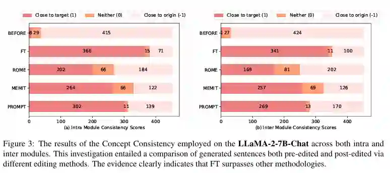 可靠性:首先需要指出的是,所有在较大语言模型上测试的方法都表现出了较高的可靠性,表明它们在概念级别定义修改中的潜力。特别是微调方法对于规模较大的模型能够进行有效的知识更新。 1. 泛化性:较大的模型在编辑后展现了比小模型更强的泛化能力。PROMPT方法在泛化性上表现尤为突出,模型能够准确理解概念的含义,并在输入前缀被重新表述时,依然能有效执行编辑任务。 1. 局部性:MEMIT方法在编辑过程中对“外部邻近项”产生了最小的影响。换句话说,MEMIT在定位和修改必要的参数时展现了较高的精确性,能够专注于目标概念的编辑,而不对模型中其他无关的知识领域产生不必要的干扰。 1. 实例变化影响:ROME方法在实例级别的变化上展示了最明显的效果,尤其是在LLaMA模型中,约三分之一的实例-类别关系发生了变化。这种现象突出了概念定义的修改如何影响实例级别的知识结构,表明概念级别的调整会在实例层面产生直接影响。 1. 概念一致性:FT微调方法表现出色,生成的定义文本在 366 个样本中更接近目标定义,仅 71 个样本保留了原始定义的语义,展现出较强的语义调整能力和稳定性。PROMPT 虽然效果略逊于 FT,但凭借较低的实施成本表现出了良好的编辑能力。 除了主要实验结果的分析说明,我们还针对概念知识编辑实验中的一些发现进行细节说明。