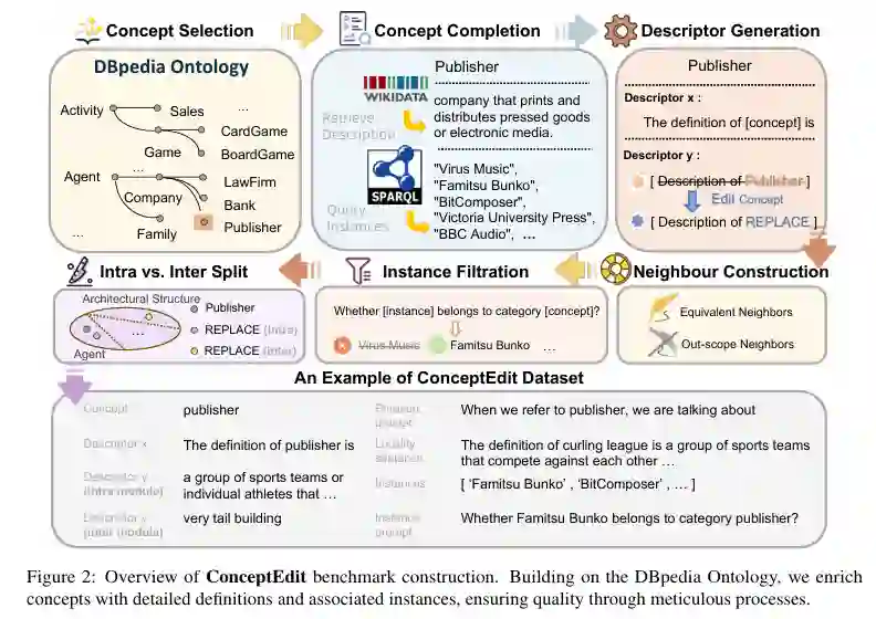 ** ****概念的选择:**本体(Ontology)是一种形式化的知识表示方法,用于定义领域内的概念及其之间的关系。在本体中,核心元素是类(Classes),它们以结构化的方式连接相关实例,体现了概念的层次性和语义关系。我们采用了广受欢迎的 DBpedia Ontology作为基础。DBpedia Ontology是一个本体概念的开放知识库,它以树状结构组织概念和实例,具备层级清晰、内容广泛的特点。并利用 type_of 关系为每个概念随机抽取了 20 个实例,用于后续任务的辅助分析。例如DBpedia Ontology中,“城市”作为一个高层级概念,包含了许多具体的实例(如“杭州”“上海”),DBpedia Ontology这种体系化的结构非常适合用于概念数据集。**概念的定义:**尽管DBpedia Ontology树状结构提供了概念和实例的基本框架,但对于每个概念的具体定义和语义描述相对匮乏。为了弥补 DBpedia 在概念定义上的不足,我们引入了另一知名知识库——Wikidata。例如,当 DBpedia 标注“摩天大楼”这一概念时,Wikidata 可以进一步补充其定义:“一种高度超过特定值的高层建筑物”。同时,为了提高数据质量,我们对所有引入的概念和定义描述进行了人工审核,替换掉模糊或不准确的描述。**数据处理:**为满足概念知识编辑的评测要求,经过描述符生成、邻近项构建、实例筛选、数据分割这四个步骤的处理最终得到结构化概念数据集 ConceptEdit。**数据统计:**经过上述数据集构建的流程,我们最终获得了ConceptEdit数据集。该数据集包含了452个不同的概念和8767个具体实例,其中这些概念被组织和归类为22个超类。