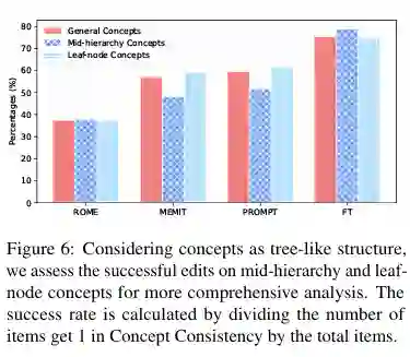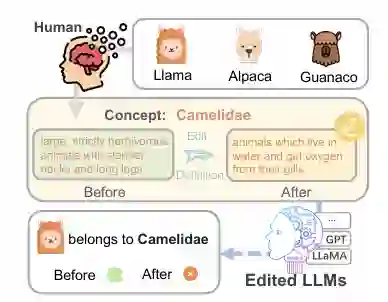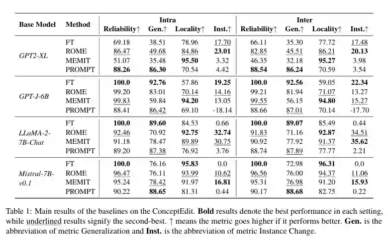 我们提出了一种概念知识编辑任务,并创建了一个新的基准测试集ConceptEdit和相应的评估指标。对FT、ROME、MEMIT和PROMPT等方法的实验表明,最近的知识编辑方法在扭曲大模型的概念级定义方面具有很高的可靠性,但在概念特定度量方面表现有限。因此需要更强大的技术和对大模型中概念的更深入理解,以进一步推进研究。