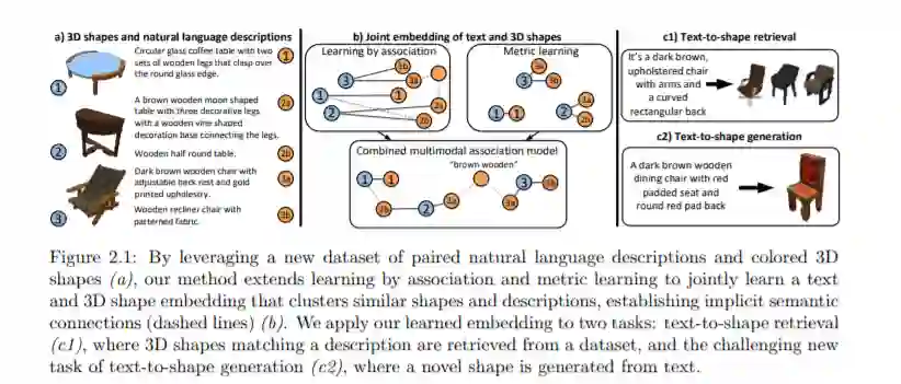 近年来,人工智能研究取得了令人难以置信的发展和进步。这些进展主要是在三个方面取得的:计算机视觉、自然语言处理和机器人技术。例如,图像识别被广泛认为是计算机视觉的圣杯,而语言建模和翻译则是自然语言处理的基本任务。然而,许多实际的应用程序和任务需要解决的不仅仅是这些特定于领域的问题,而是需要解决同时涉及所有三个领域的问题。一个自主系统不仅需要能够识别图像中的物体,还需要能够解释自然语言描述或命令,并理解它们如何与其感知到的视觉观察相关联。此外,机器人需要利用这些信息来做决策,并决定采取哪些物理行动来完成任务。在本文的第一部分中,我提出了一种学习如何将自然语言和3D形状联系起来的方法,这样系统就可以将文本描述中描述的单词(如“round”)与3D对象中圆形的几何属性联系起来。为了将这两种模式联系起来,我们依赖一个跨模态嵌入空间来进行多模态推理,并在没有细粒度的属性级分类注释的情况下学习这个空间。通过学习如何将这两种模态联系起来,我们可以执行文本到形状的检索和形状操作等任务,也可以执行新的任务,如文本到形状的生成。在本论文的第二部分中,我们允许代理被嵌入并探索一个依赖于所有三个领域(计算机视觉、自然语言和机器人)的任务:通过遵循自然语言指令进行机器人导航。与依赖固定的图像或3D对象数据集不同,代理现在位于一个物理环境中,并使用机载摄像机捕捉自己对空间的视觉观察。为了把视觉、语言和机器人的物理状态联系起来,我们提出了一个使用拓形图进行规划和控制的系统。这种基本的抽象允许主体将语言指令的部分与环境的相关空间区域联系起来,并将一系列的视觉观察与物理运动和动作联系起来