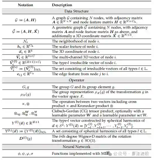 几何图形定义为:⃗G := (A, H, ⃗X),其中A∈[0,1]N×N是邻接矩阵,H∈RN×C是节点特征矩阵,维度为C,⃗X∈RN×3是所有节点的三维坐标。几何图形的变换包括置换、正交变换(旋转和反射)和平移。置换定义为g · ⃗G := (PgAPg ⊤, PgH, Pg ⃗X),正交变换定义为g · ⃗G := (A, H, ⃗XOg),平移定义为g · ⃗G := (A, H, ⃗X + ⃗tg)。欧几里得群E(3)是正交变换和平移的半直积,表示为E(3) = T(3) ⋉ O(3)。几何图形是用于在科学任务中建模各种对象的强大而通用的工具,包括小分子、蛋白质、晶体、物理点云等以及许多其他对象。