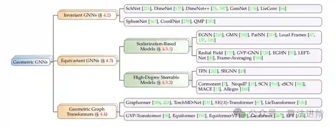 高阶可调模型是指在等变 GNN 中,通过使用更高阶的旋转表示来扩展等变 GNN 的能力。这种方法使用 Wigner-D 矩阵将 3D 旋转转换为群表示的不同阶数,使用球谐函数将 3D 向量转换为不同类型的可操纵特征,并使用 Clebsch-Gordan 张量积执行等变映射。这种方法可以扩展等变 GNN 的能力,使其能够处理更复杂的几何图形。这种方法在 TFN、SEGNN、Cormorant、NequlP、SCN、eSCN、MACE、Allegro、Graphormer、TorchMD-Net、SE(3)-Transformer、LieTransformer、GVP-Transformer、Equiformer、EquiformerV2、Geoformer 和 EPT 等模型中得到了应用。 4.4 几何图Transformers