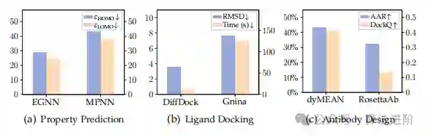本文对几何图神经网络(GNNs)进行了系统综述,重点介绍了方法和应用。 首先介绍了群论和协变性/不变性的形式定义等预备知识,然后提出了几何图作为通用数据结构,将现实世界数据和模型联系起来。接下来,将现有的模型分为不变GNNs和协变GNNs,后者又进一步分为基于标量化的模型和高阶可调模型。此外,还介绍了几何图变换器。最后,提供了几何GNNs在基于粒子的物理系统、分子、蛋白质、复合物以及晶体和RNA等其他领域中成功应用的全面集合。本调查的目标是提供一个全面的概述,包括数据结构、模型设计和应用,对机器学习从业人员在各种科学任务上使用几何GNNs具有指导意义。 图1 几何图神经网络与传统方法在分子性质预测、蛋白质-配体对接和抗体设计方面的性能比较。
